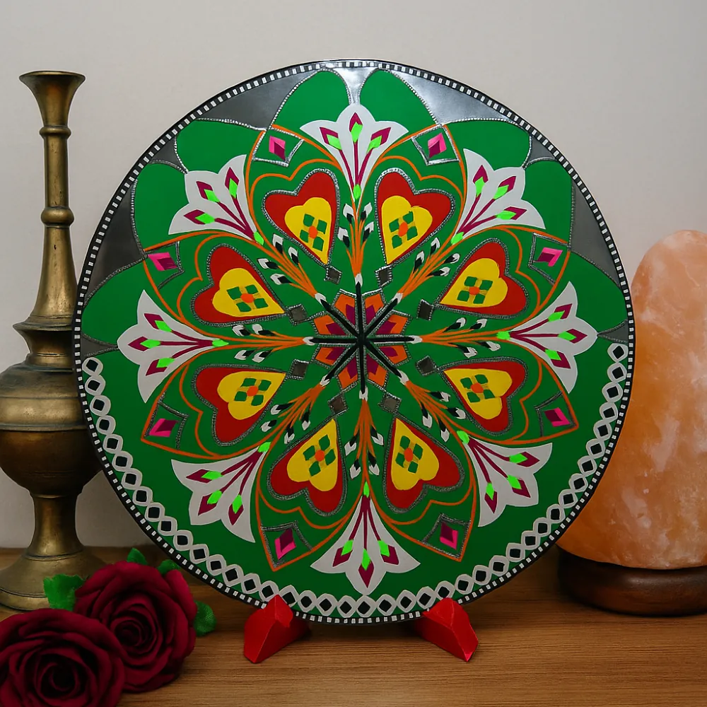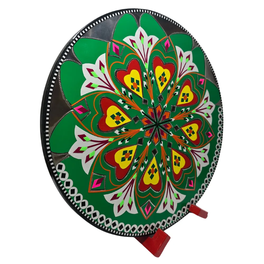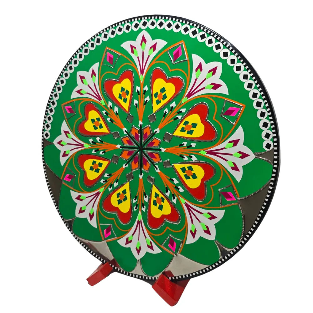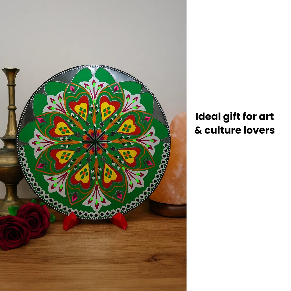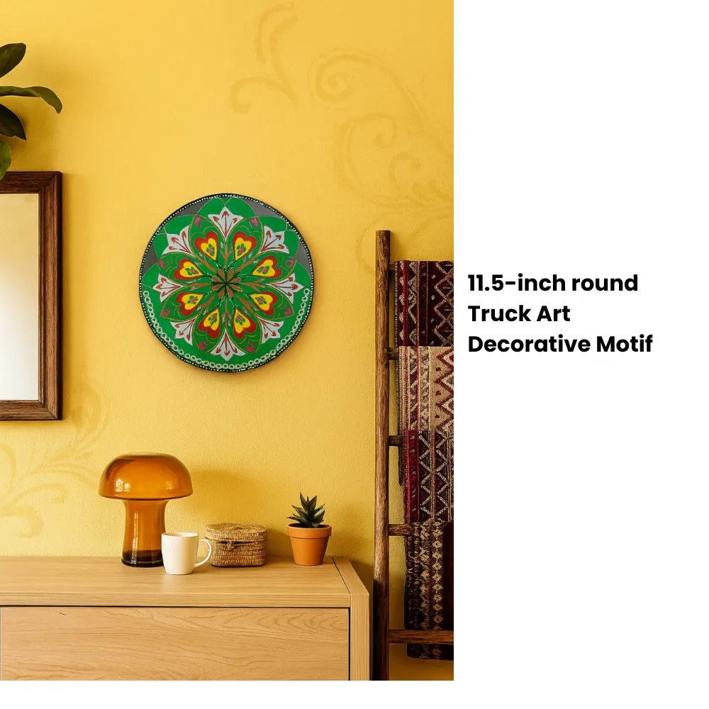 Bring the colors and culture of Pakistan into your space with this handmade 11.5-inch round artistic decorative motif. Designed in the traditional art style, this piece is perfect for brightening up your home, office, café, or gift shop.