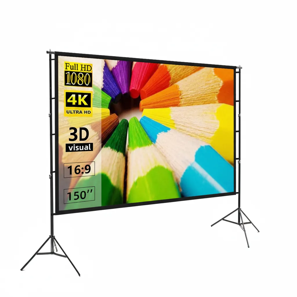 The 150-Inch 16:9 Portable Tripod Projector Screen delivers a cinematic viewing experience anywhere—indoors or outdoors. Featuring a large 150-inch diagonal (132" × 74" viewing area) with a 1.2 high-gain matte white PVC fabric, it supports 4K Ultra HD, Full HD 1080p, and active 3D projection with excellent color reproduction, wide 160° viewing angle, and black-backed design to prevent light penetration. The height-adjustable aluminum tripod stand extends from 70cm to 230cm, allowing flexible setup on uneven surfaces. The screen rolls up smoothly into a protective metal casing via an auto-lock spring mechanism for easy storage and portability. Lightweight yet sturdy, the entire unit folds compactly and includes a carrying bag. Wrinkle-resistant fabric stays flat with side tension hooks and bottom weight bar. Perfect for home theater, business presentations, classrooms, weddings, camping, and backyard movie nights.