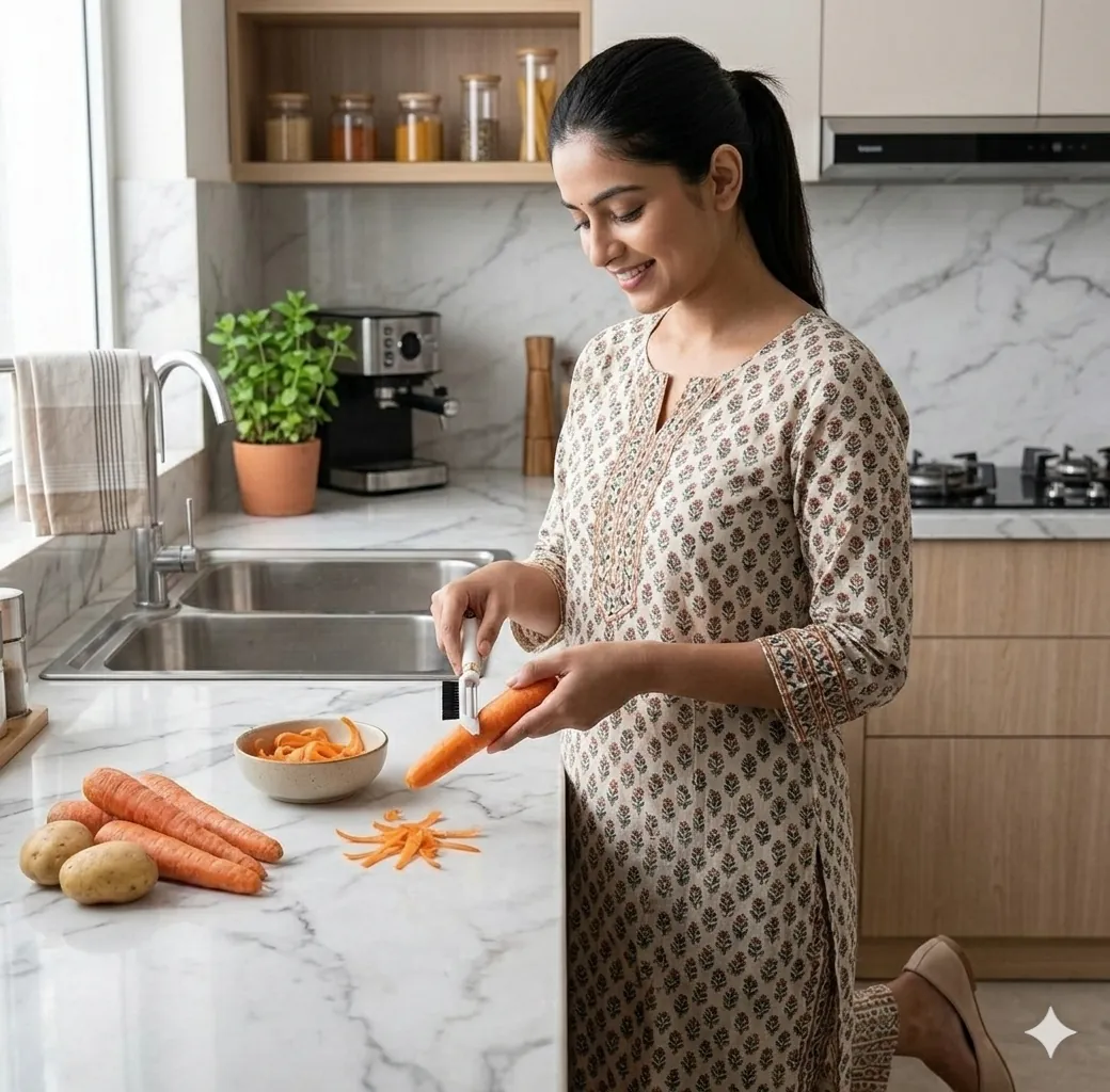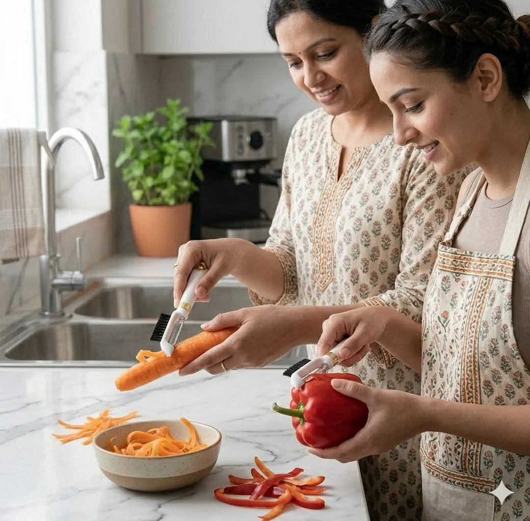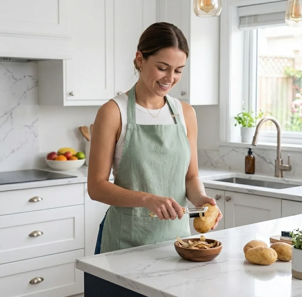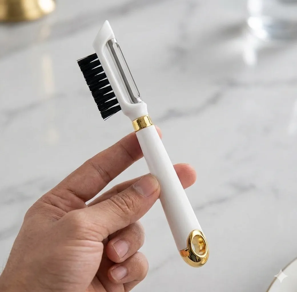 The Premium 2-in-1 Kitchen Peeler & Scrubber is the ultimate tool for a modern, efficient kitchen. Designed to save you time and counter space, this gadget combines two essential kitchen tasks into one sleek device. Use the sharp side to peel apples, potatoes, and cucumbers with ease, then flip it over to use the dense bristles for scrubbing away stubborn dirt from root vegetables. Built with a durable, food-grade plastic body and a rust-resistant stainless steel blade that stays sharp even after multiple uses. Featuring a sophisticated white body with premium gold accents, this tool isn't just functional—it's a decorative piece for your kitchen drawer.The handle is ergonomically shaped to provide a comfortable grip, reducing hand fatigue during long meal prep sessions.