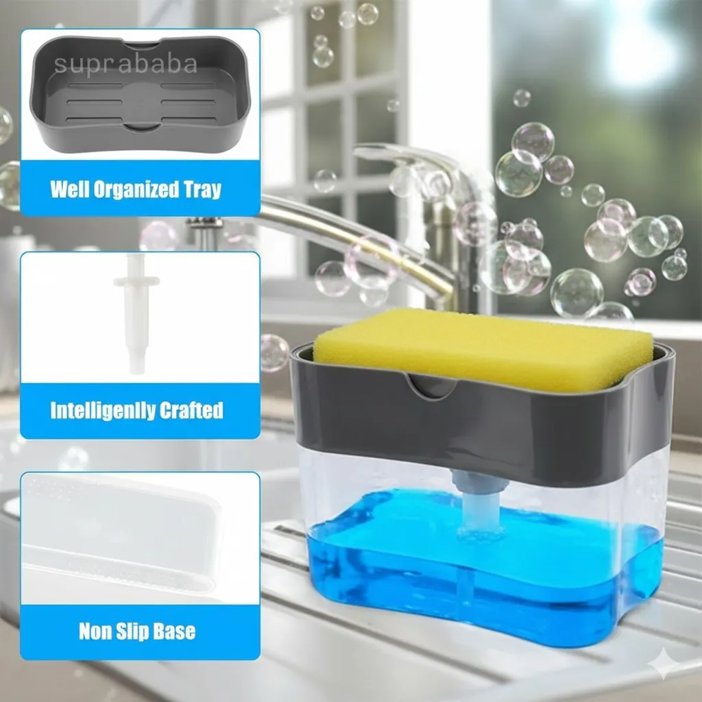 2-in-1 Pumping Type Dish Soap Dispenser and Sponge Caddy | Kitchen Sink Organizer | PP Material, Compact Size 13x10x7cm | No-Mess One-Hand Operation