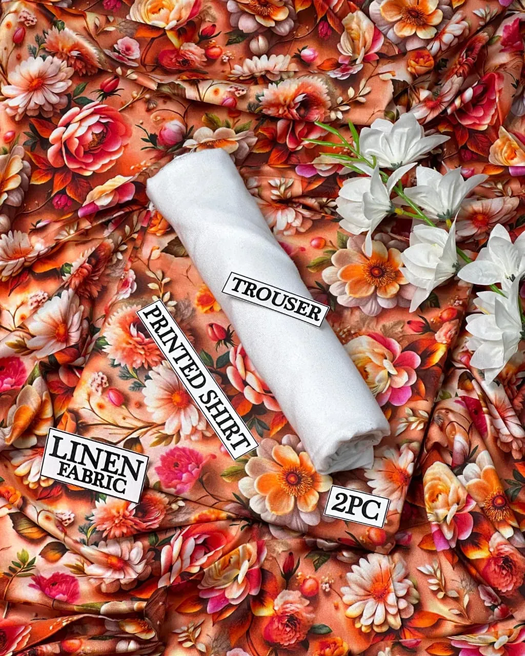 This stylish 2-piece linen dress is a must-have for your summer collection. The set features a beautifully designed floral printed shirt that pairs perfectly with a contrasting plain white trouser. Crafted from high-quality, breathable linen fabric, this dress ensures maximum comfort and a lightweight feel, making it perfect for all-day wear. The vibrant floral pattern in shades of orange and pink, along with the crisp white trouser, creates a chic and trendy look suitable for various occasions. Whether it's a casual day out, a relaxed office setting, or a comfortable everyday outfit, this women's dress offers a blend of elegance and simplicity. Its versatile design makes it easy to accessorize, while the durable fabric guarantees long-lasting use. Shop this fashionable printed linen suit and upgrade your wardrobe with a piece that is both stylish and comfortable.