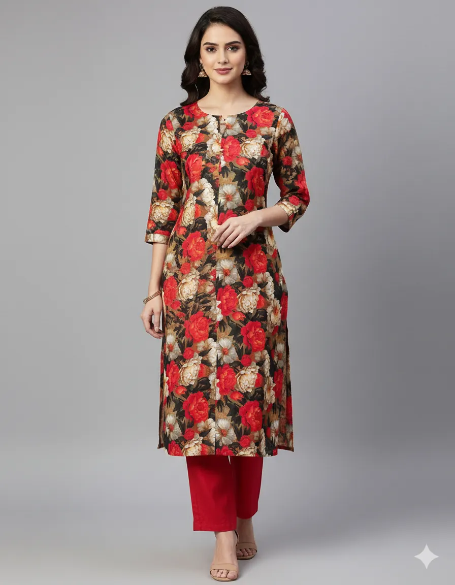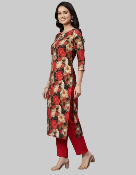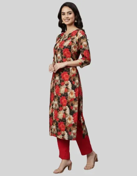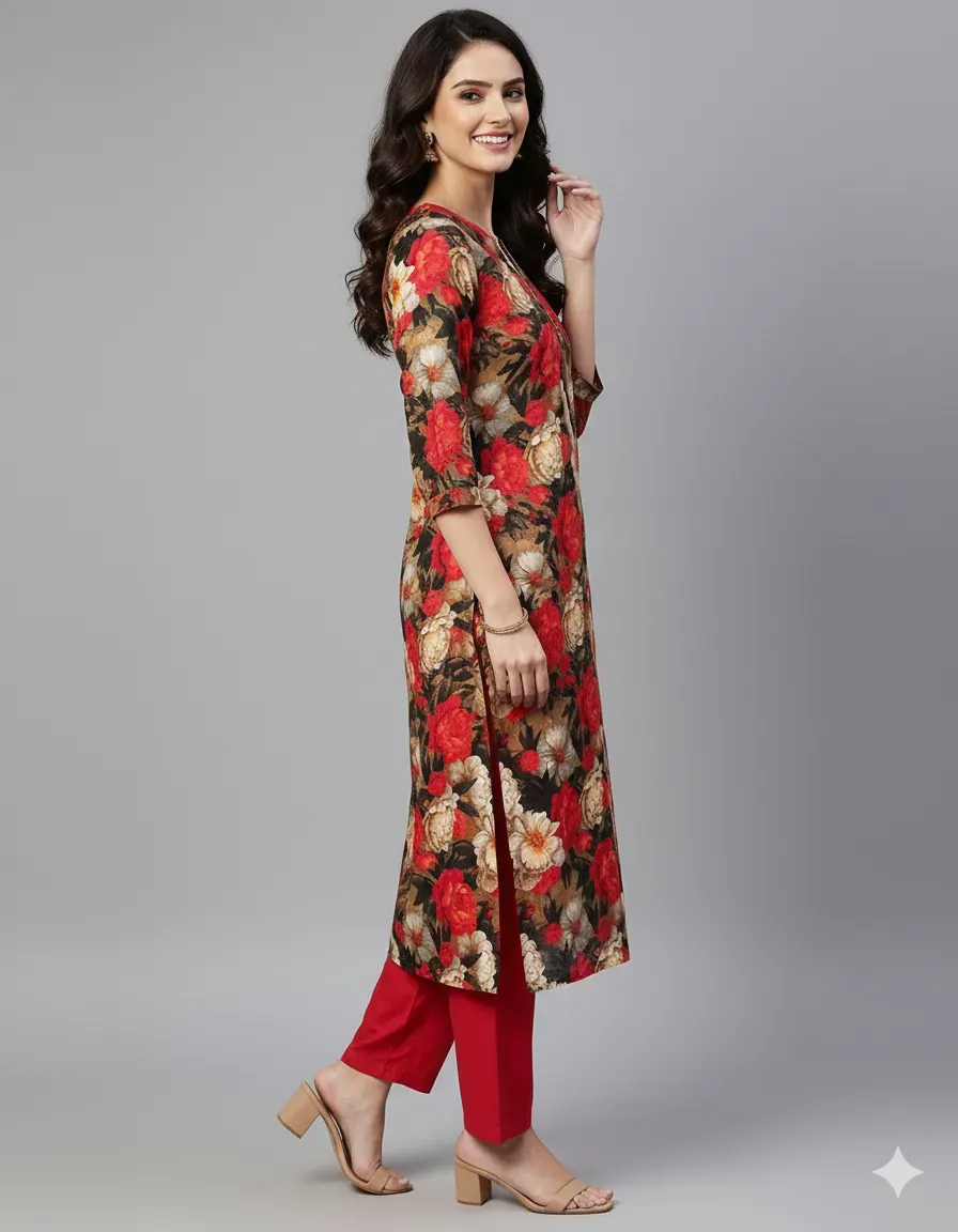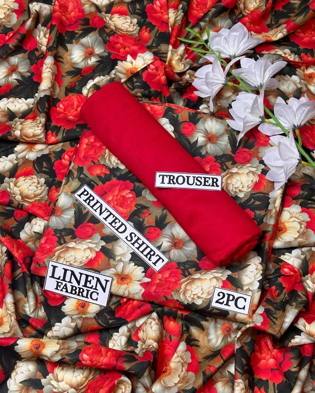 This stylish 2-piece linen dress is a must-have for your summer collection. The set features a beautifully designed floral printed shirt with vibrant red and white flowers on a sophisticated dark background, which pairs perfectly with a contrasting plain red trouser. Crafted from high-quality, breathable linen fabric, this dress ensures maximum comfort and a lightweight feel, making it perfect for all-day wear. The bold color combination creates a chic and trendy look suitable for various occasions. Whether it's a casual day out, a relaxed office setting, or a comfortable everyday outfit, this women's dress offers a blend of elegance and simplicity. Its versatile design makes it easy to accessorize, while the durable fabric guarantees long-lasting use. Shop this fashionable printed linen suit and upgrade your wardrobe with a piece that is both stylish and comfortable.