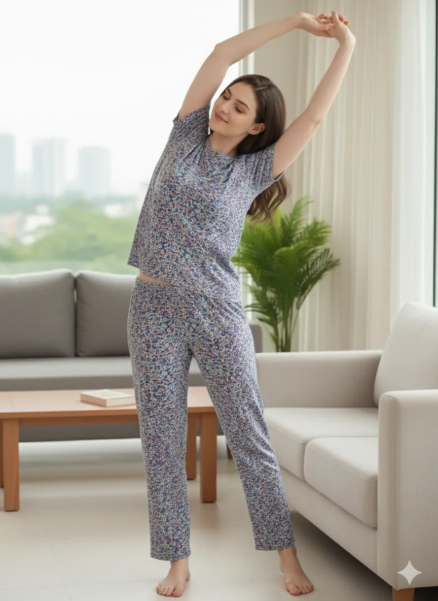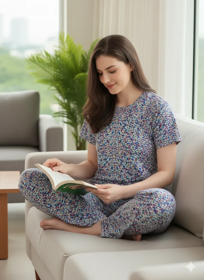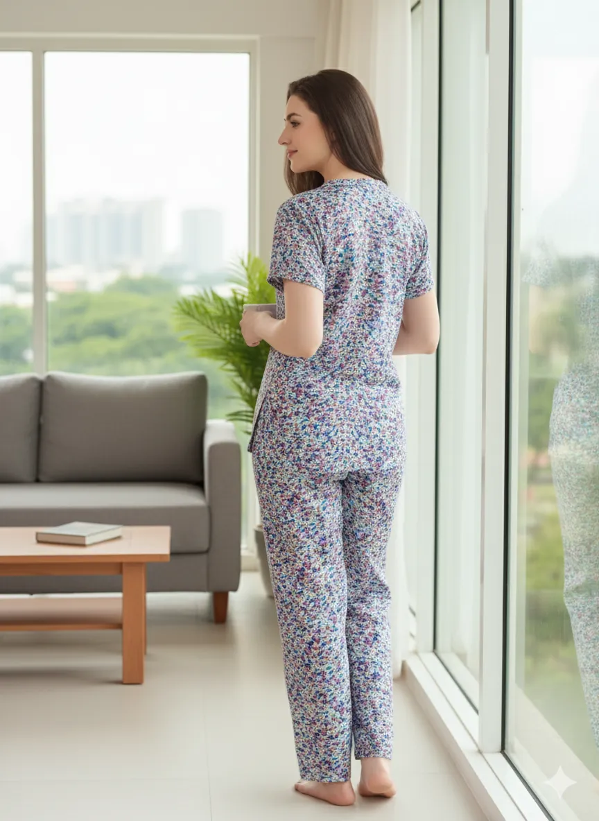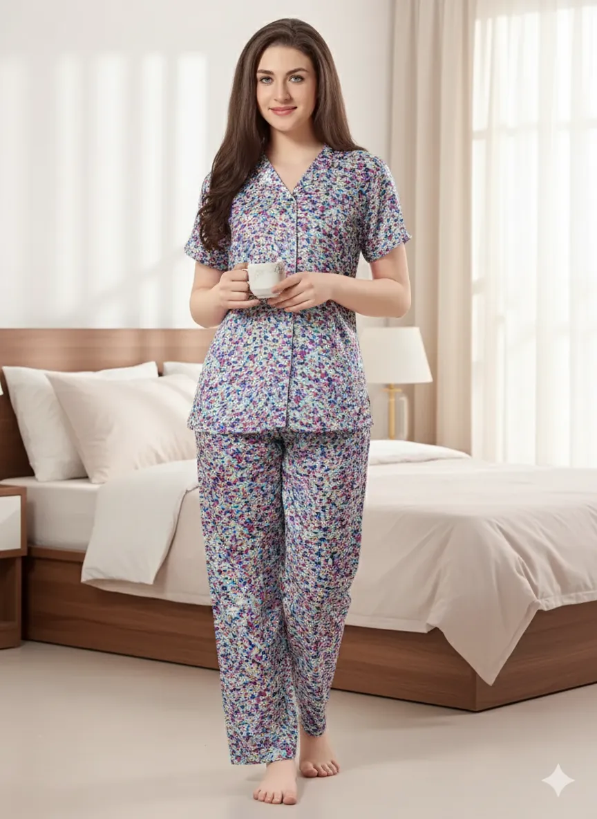 Featuring a short-sleeve button-down top and matching straight pants, this floral-printed night suit offers a relaxed fit with a stylish yet cozy look. Whether you're winding down after a long day or enjoying a lazy weekend morning, this night suit is your perfect companion.