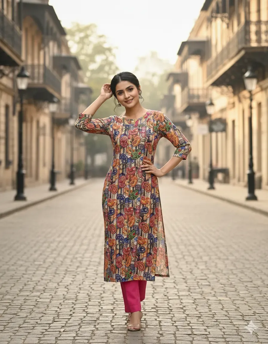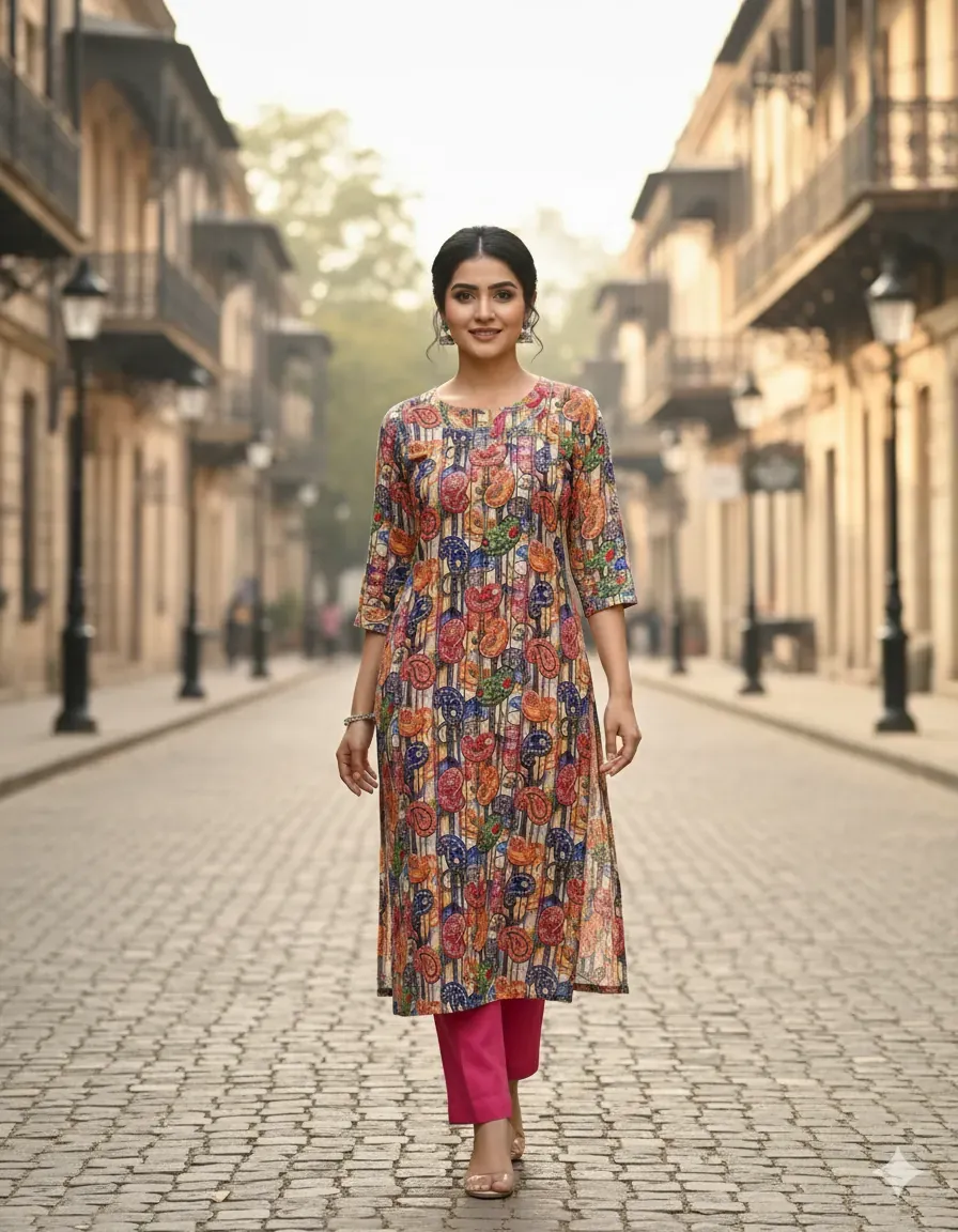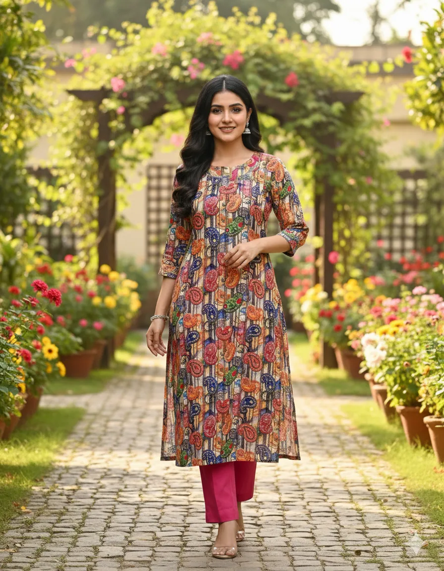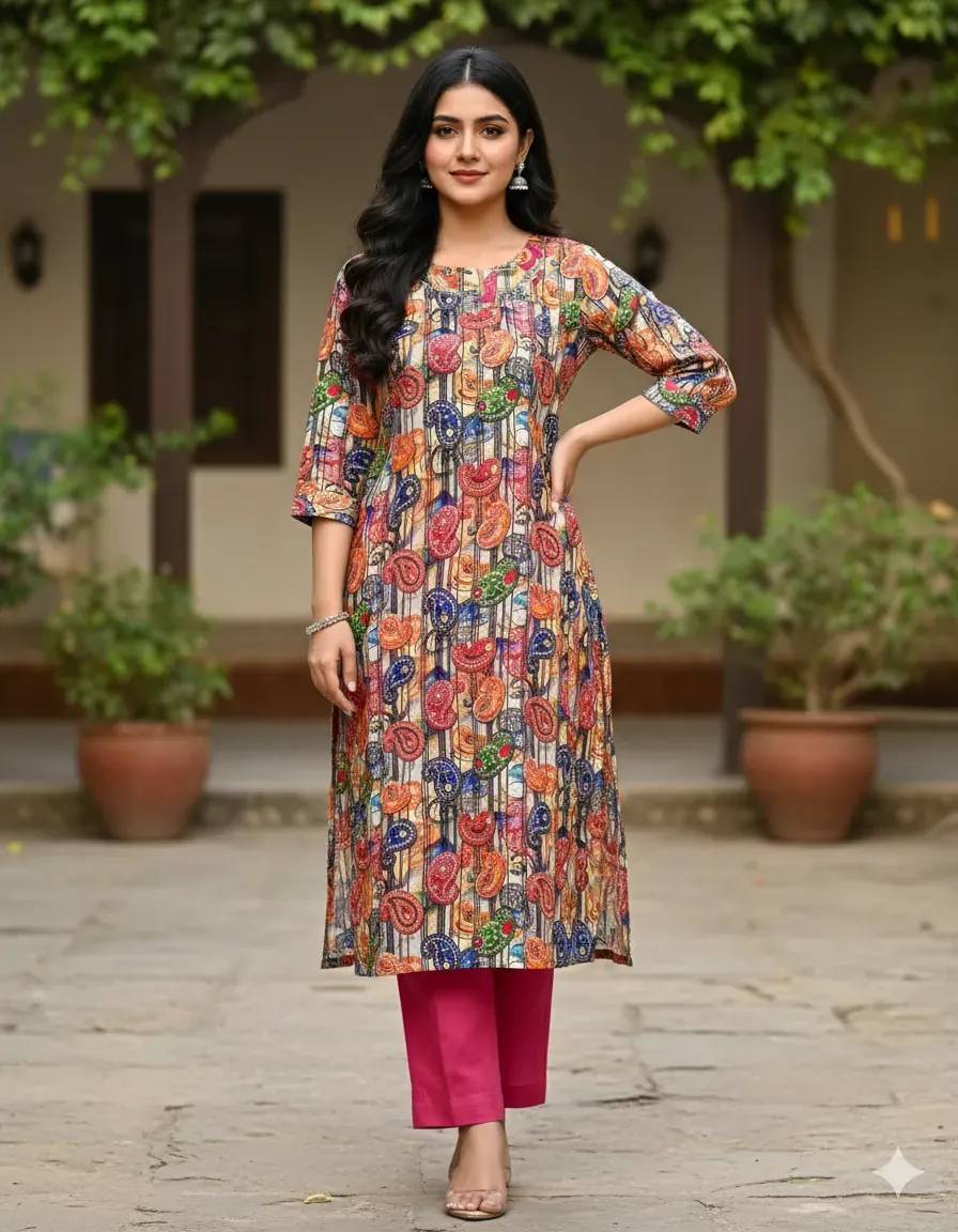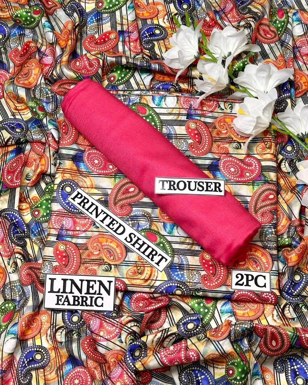This stylish 2-piece linen dress is a must-have for your summer collection. The set features a uniquely designed multicolor paisley printed shirt with a vibrant mix of colors on a sophisticated striped background, which pairs perfectly with a bright, contrasting plain fuchsia trouser. Crafted from high-quality, breathable linen fabric, this dress ensures maximum comfort and a lightweight feel, making it perfect for all-day wear. The bohemian-inspired pattern and bold solid color create a chic and trendy look suitable for various occasions. Whether it's a casual day out, a relaxed outing, or a comfortable everyday outfit, this women's dress offers a blend of vibrant style and simplicity. Its versatile design makes it easy to accessorize, while the durable fabric guarantees long-lasting use. Shop this fashionable printed linen suit and upgrade your wardrobe with a piece that is both stylish and comfortable.