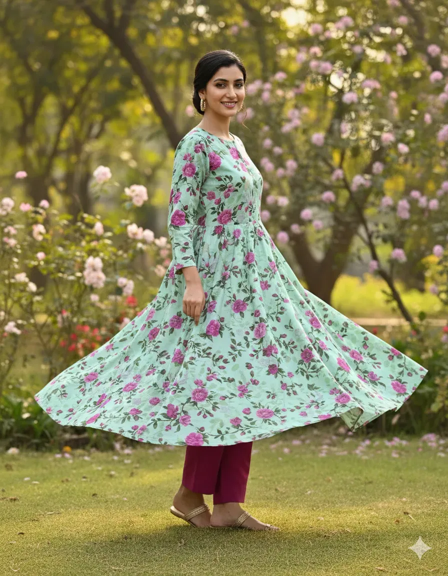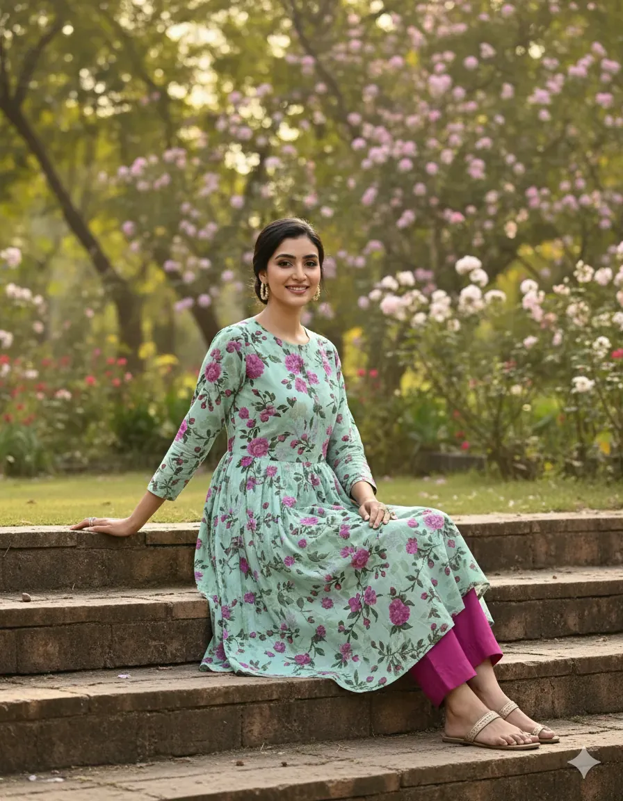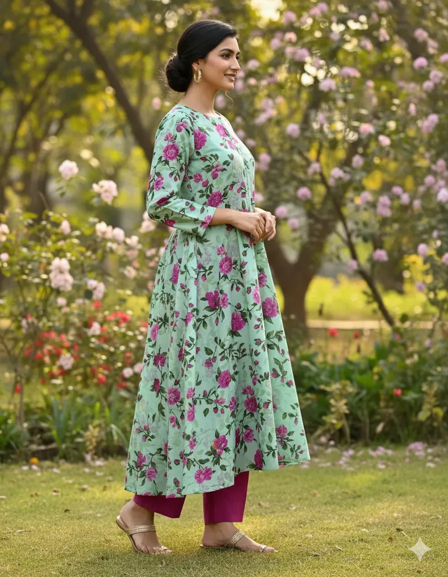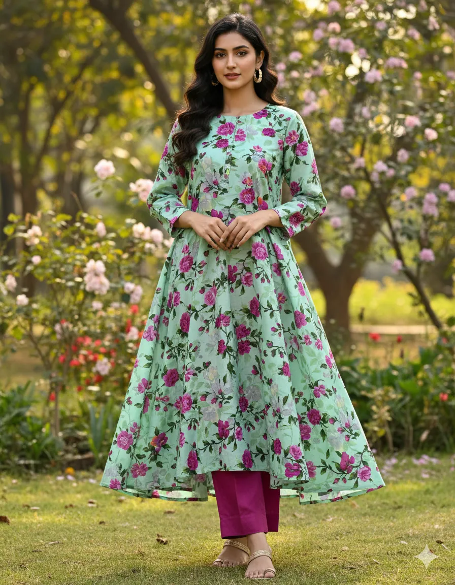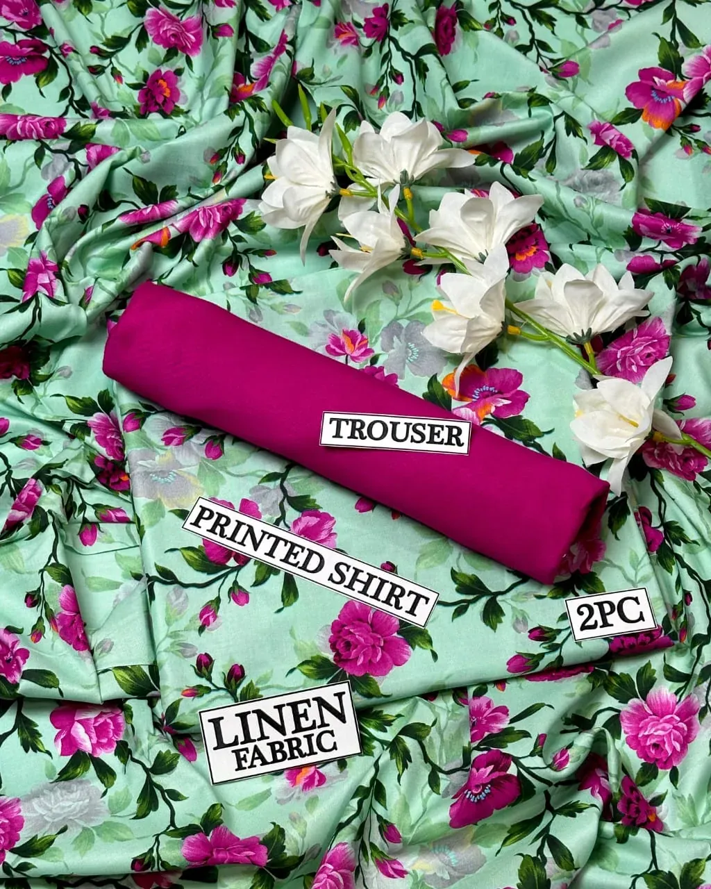 This stylish 2-piece linen dress is a must-have for your summer collection. The set features a beautifully designed floral printed shirt that pairs perfectly with a contrasting plain trouser. Crafted from high-quality, breathable linen fabric, this dress ensures maximum comfort and a lightweight feel, making it perfect for all-day wear. The vibrant floral pattern on a soothing light green base, along with the bold fuchsia trouser, creates a chic and trendy look suitable for various occasions. Whether it's a casual day out, a relaxed office setting, or a comfortable everyday outfit, this women's dress offers a blend of elegance and simplicity. Its versatile design makes it easy to accessorize, while the durable fabric guarantees long-lasting use. Shop this fashionable printed linen suit and upgrade your wardrobe with a piece that is both stylish and comfortable.