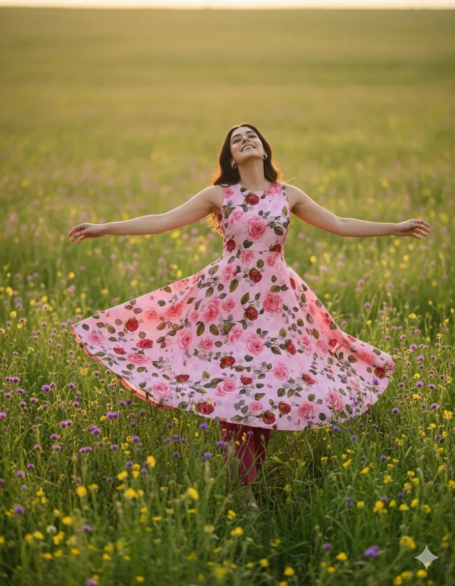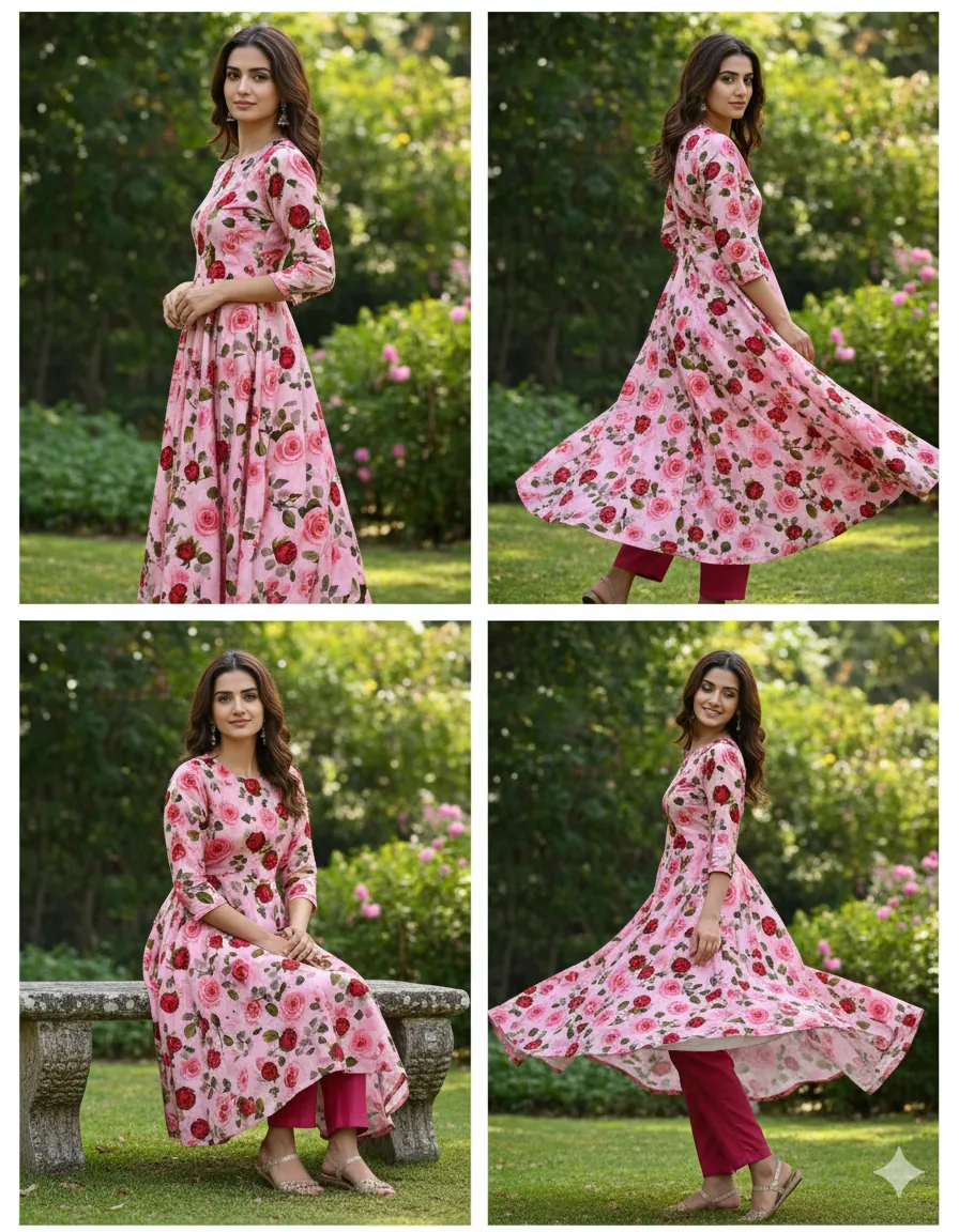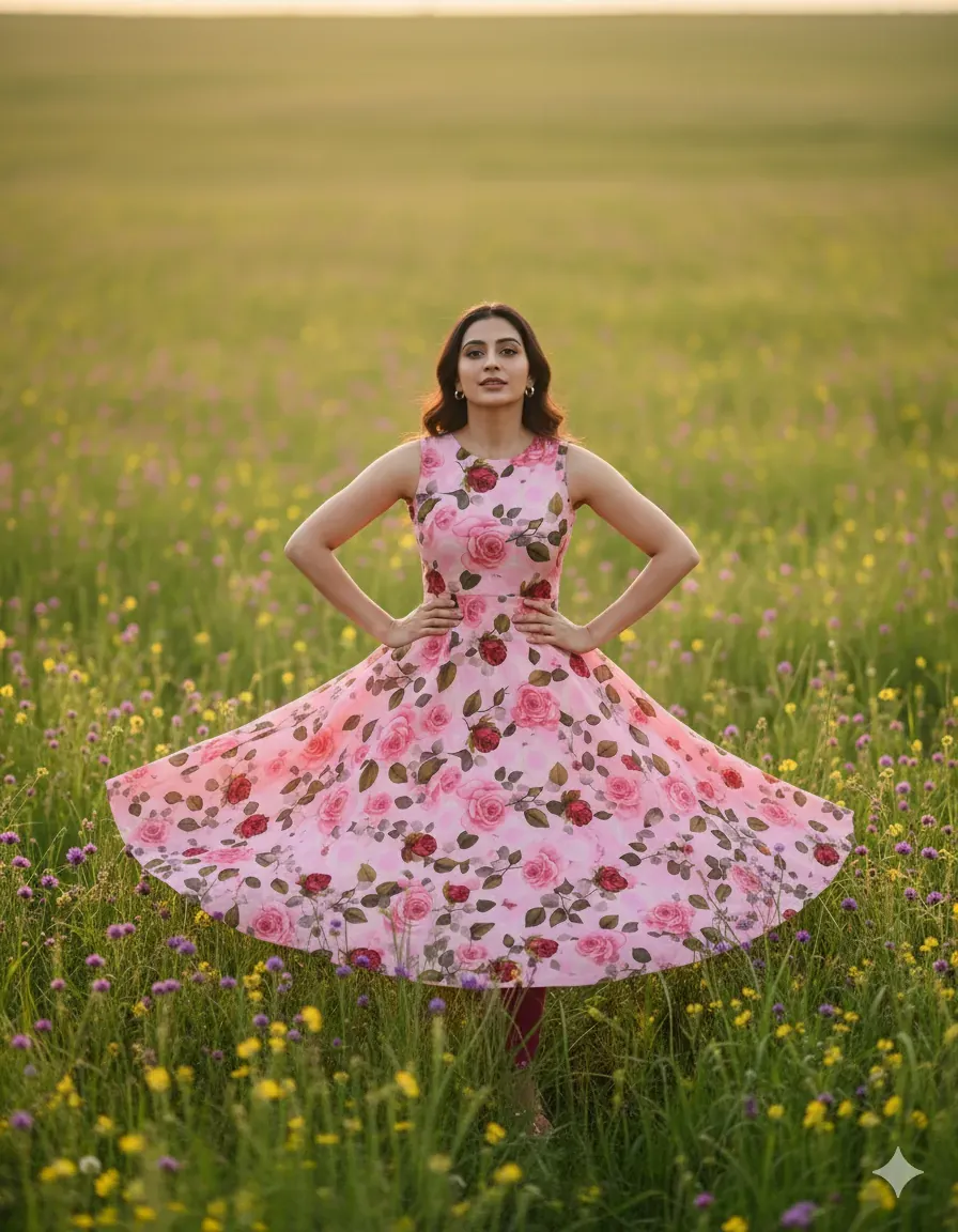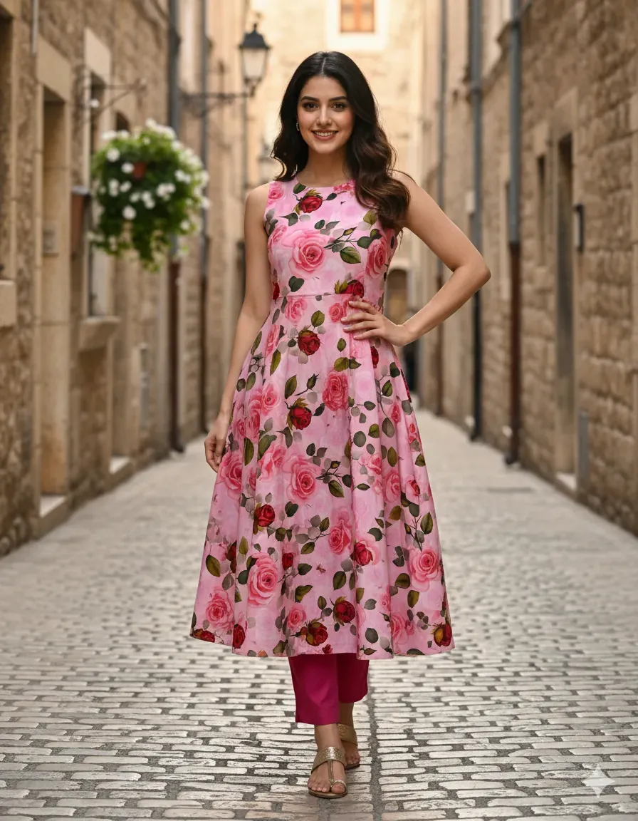 2-Piece Rose Print Linen Dress for Women | Stylish Pink & Fuchsia Suit Set | Summer Collection