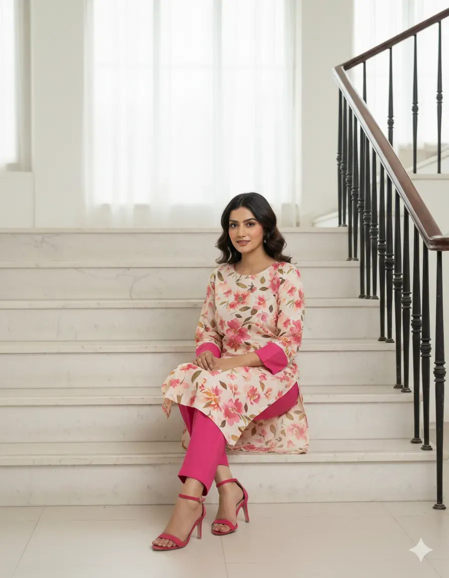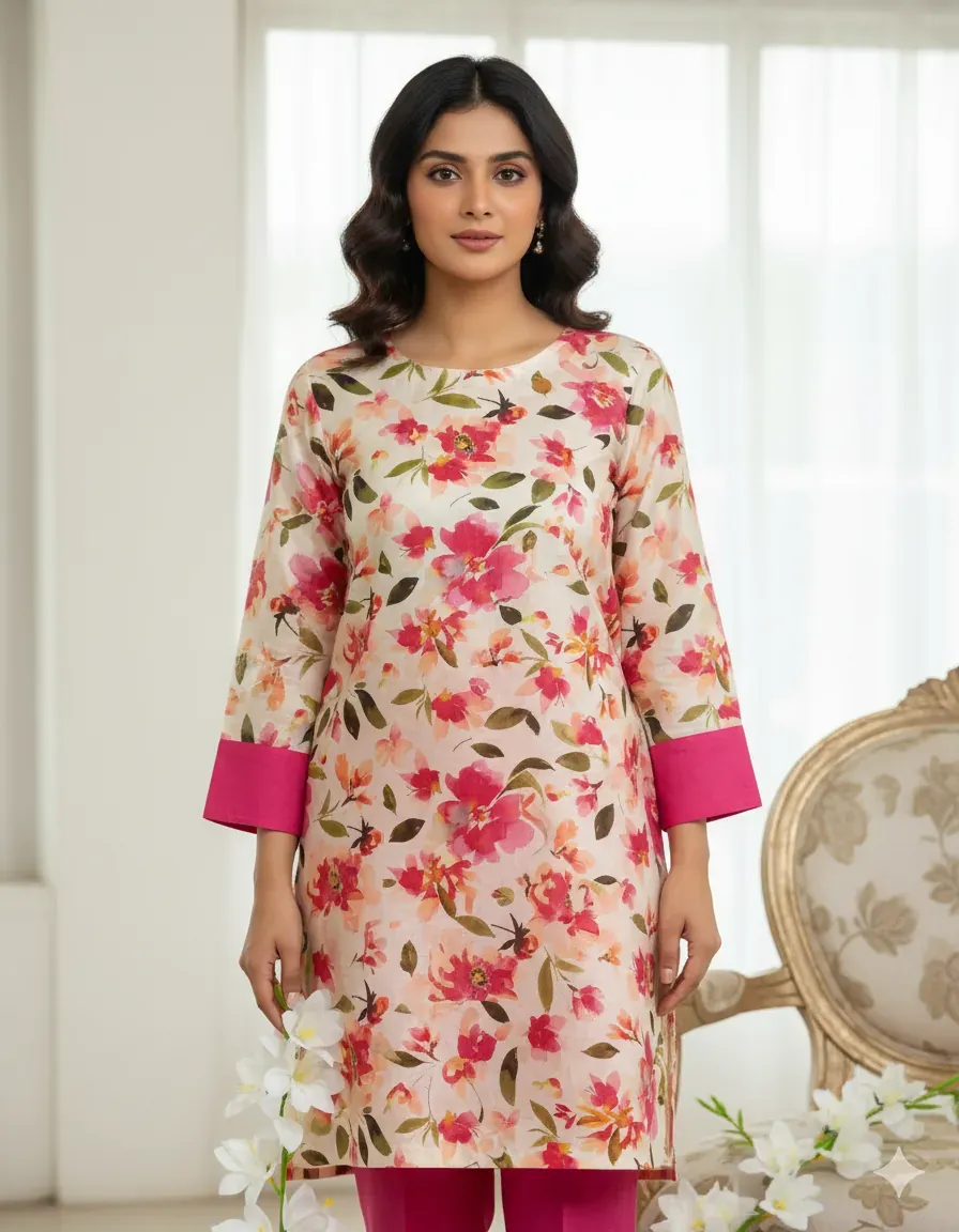 Step out in style with this beautiful 2-piece linen suit. The set includes a digitally printed linen shirt adorned with a striking watercolor-style floral pattern in shades of pink, red, and peach on a cream background. Paired with this eye-catching top are solid hot pink linen trousers, creating a dynamic and fashionable contrast. Crafted from premium quality linen fabric, this suit is designed for breathability and comfort, making it an excellent choice for warmer weather. The unstitched fabric allows for personalized tailoring, ensuring a perfect fit for any occasion, from casual outings to festive gatherings.