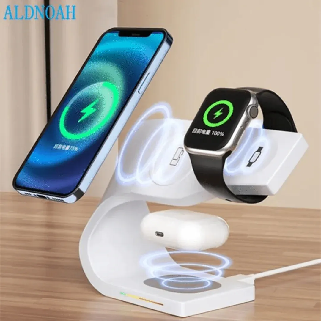 This 3‑in‑1 wireless magnetic charging pad lets you charge your smartphone, earbuds (e.g., AirPods) and smartwatch simultaneously on one compact unit. It supports up to 15 W fast wireless charging for compatible smartphones, providing reliable power delivery along with built‑in magnetic alignment to ensure your phone stays in place. The pad features dedicated zones for your earbuds and smartwatch so you don’t need separate chargers. Built with a premium ABS/PC or ABS/silicone material mix, it includes safety protections (over‑heat, over‑current, foreign‑object detection) and a tidy, minimal footprint for nightstand or desk use. Ideal for users of device ecosystems who wish to reduce cable clutter while maintaining fast wireless charging capability.