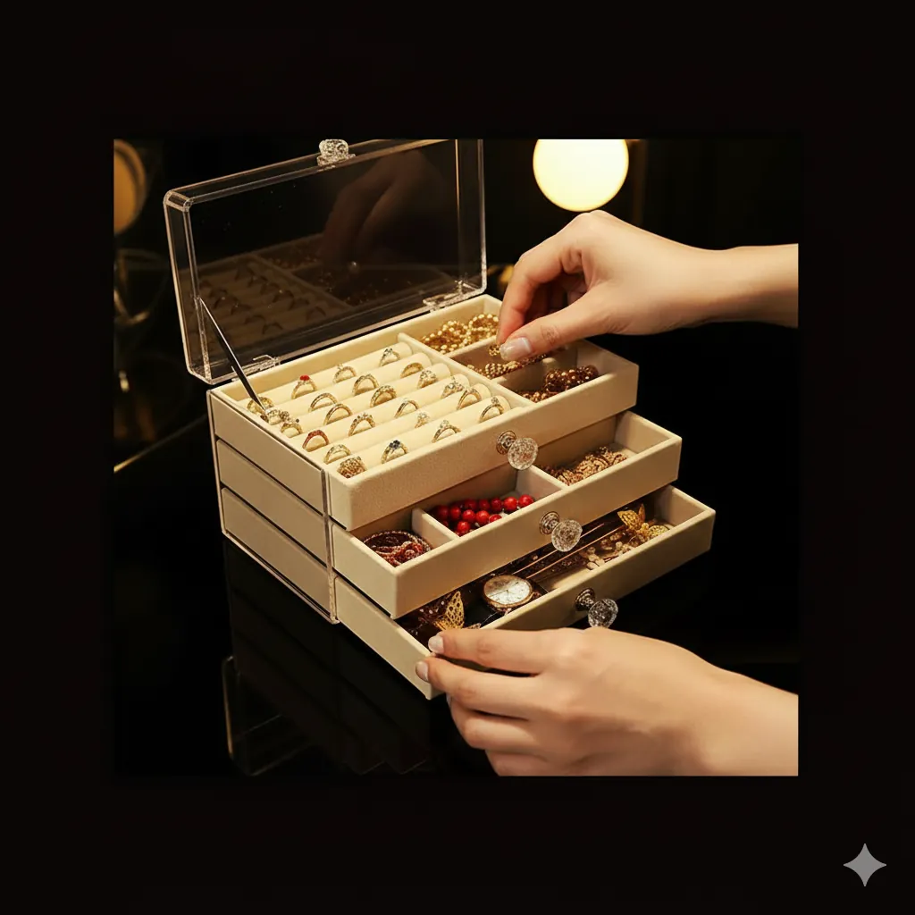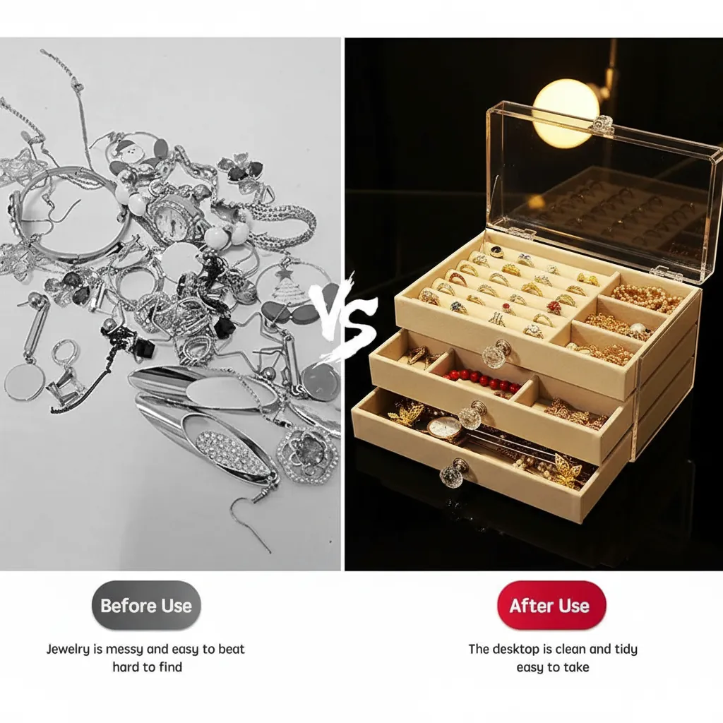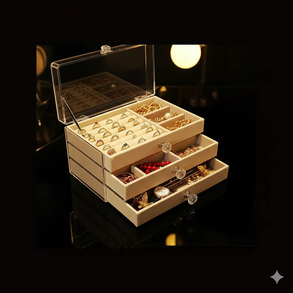 The 3-Layer Jewellery Organizer is the perfect solution for keeping all your jewelry organized, protected, and easily accessible. With three spacious layers, it separates necklaces, earrings, rings, bracelets, and watches, preventing tangles and scratches. Each layer features multiple compartments and cushioned slots for delicate pieces. Its sleek, compact design fits on dressers or vanity tables while adding a touch of elegance. Ideal for daily use or travel, this jewelry organizer keeps everything in place and beautifully displayed. Made from high-quality materials, it is durable, lightweight, and easy to maintain, making it a must-have accessory for jewelry lovers.