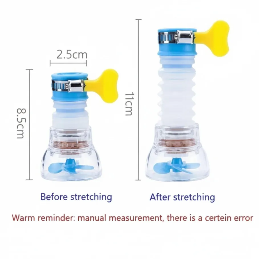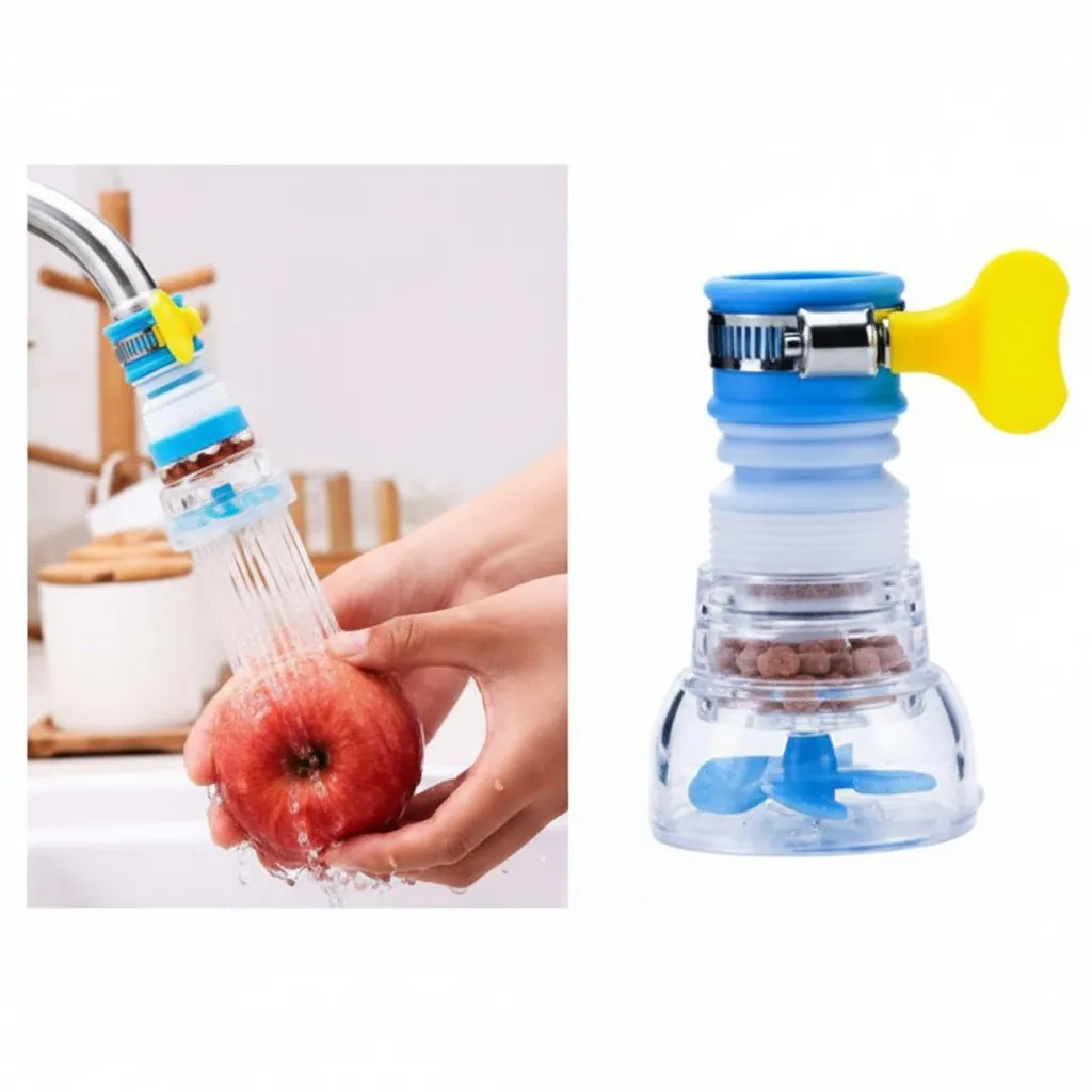 The unit features two adjustable water modes (likely a focused stream and a wide spray) and a visible built-in filter (the brown beads shown) that helps trap impurities. A unique internal propeller (fan) increases water pressure while simultaneously saving water by aerating the stream and minimizing splash. Made from durable plastic with a metal clamp and butterfly adjustment handle, this faucet aerator is a simple and cost-effective way to improve kitchen efficiency.