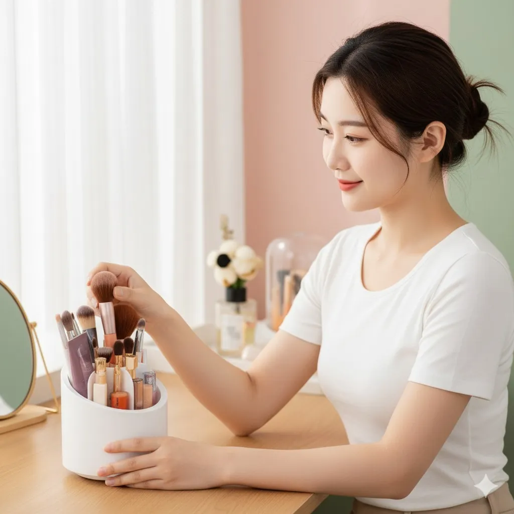 Organize your beauty essentials effortlessly with our 360-Degree Rotating Makeup Brush Organizer. This premium cosmetic holder is designed for ultimate convenience and hygiene. The smooth 360° rotating base allows you to access any brush, pencil, or cosmetic item with a simple spin, saving you time during your daily routine.