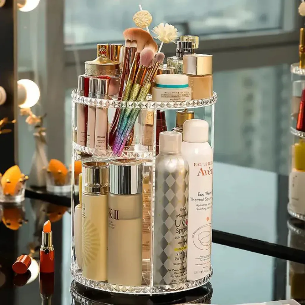 The 360° Rotating Makeup Organizer Stand is a modern and practical solution for keeping all your cosmetics perfectly organized. With its smooth full-circle rotation, you can easily access makeup items from any angle without clutter or mess.