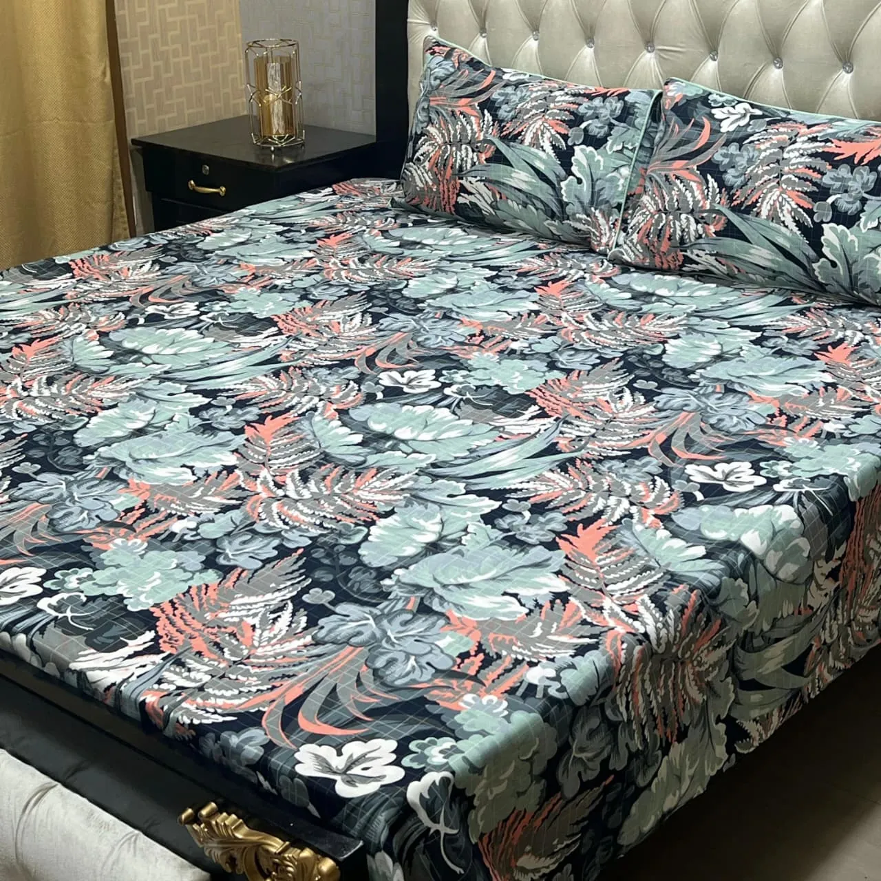 Add a bold and elegant touch to your bedroom with this 3D Crystal Cotton King Size Bedsheet Set, featuring a luxurious tropical floral design in shades of mint green, coral, and grey on a dark navy base. This bedsheet is crafted from 100% premium crystal cotton, known for its softness, sheen, and durability.