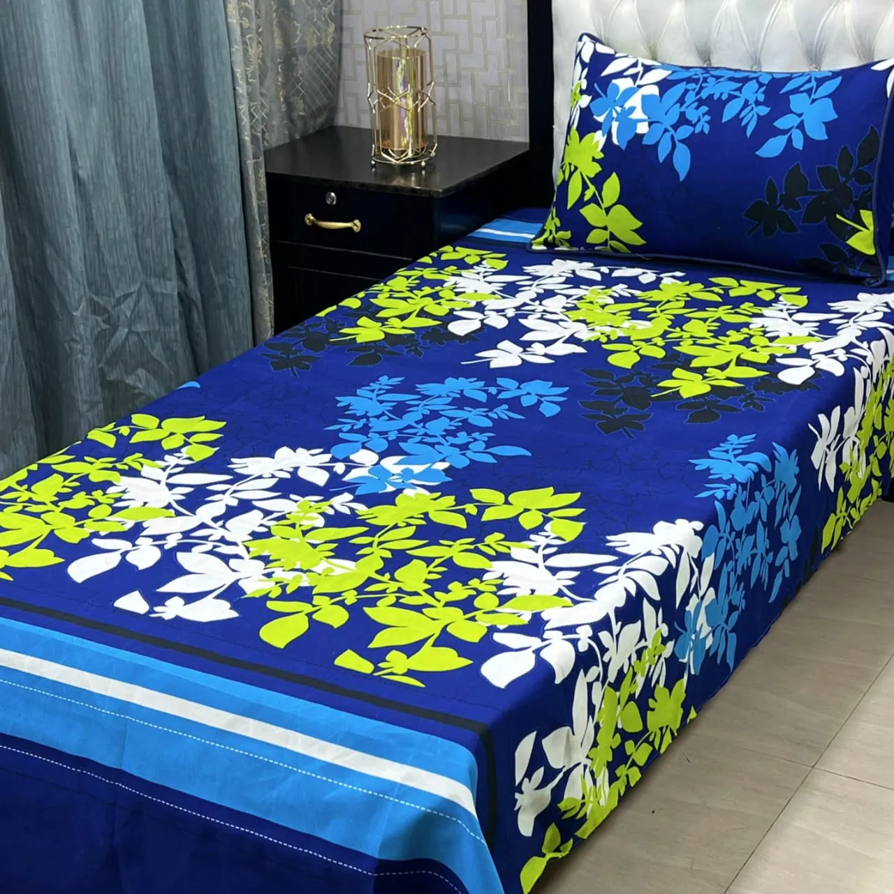 Enhance your sleep experience with this 3D-Crystal Cotton Single Bedsheet Pair, featuring an elegant floral blue design with vibrant tones of blue, green, white, and black. Perfect for single beds or twin setups, this combo includes: