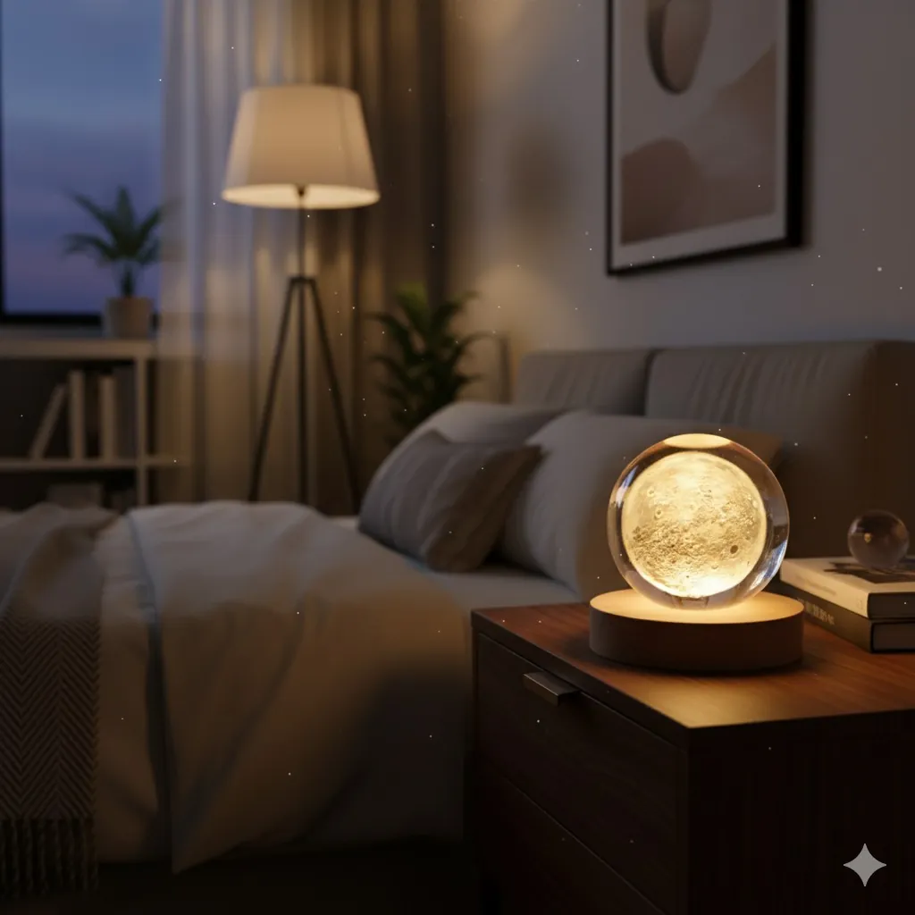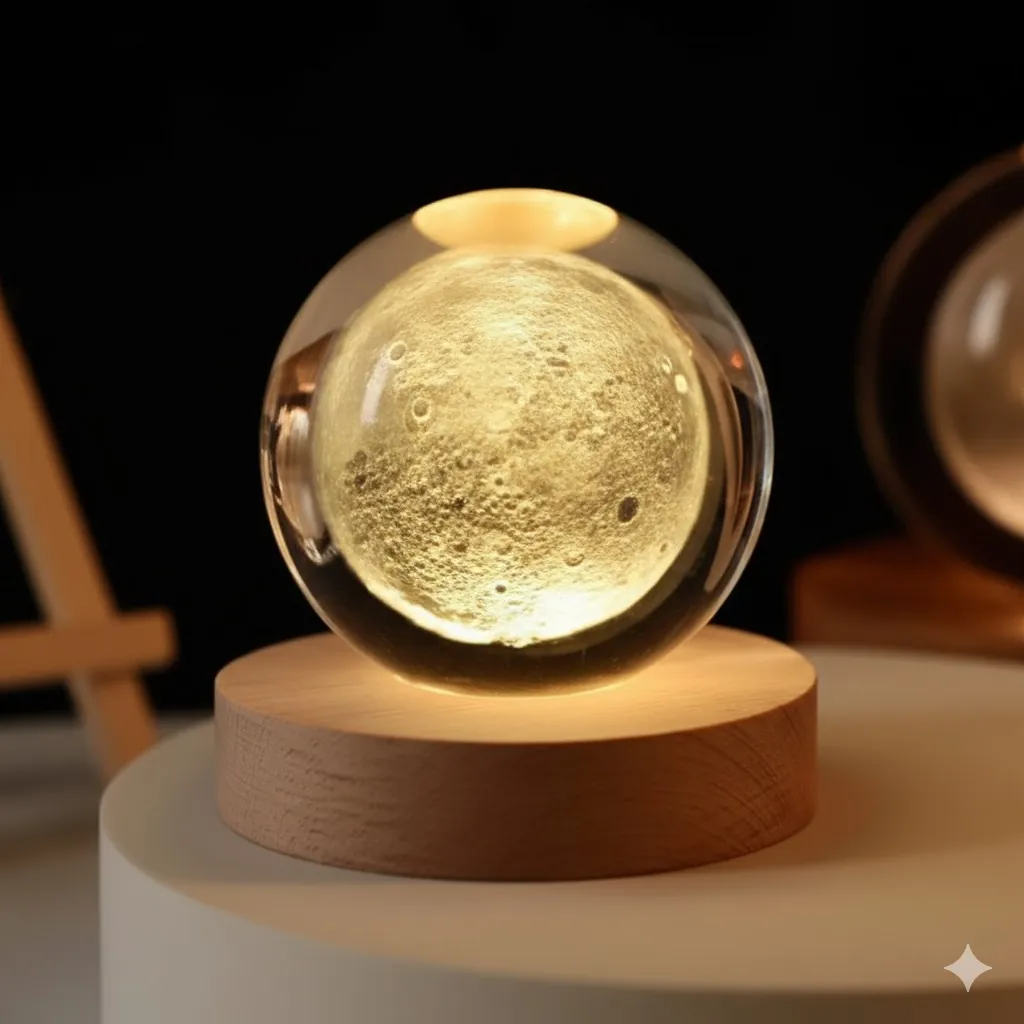 Bring the enchanting beauty of the cosmos into your home with this exquisite 3D Engraved Moon Crystal Ball Lamp. This captivating night light showcases a highly detailed, three-dimensional rendition of the Moon's surface, meticulously laser-engraved within a high-quality clear crystal sphere. When illuminated, the intricate craters and topography of the moon come to life, casting a soft, warm LED glow that creates a tranquil and magical ambiance.