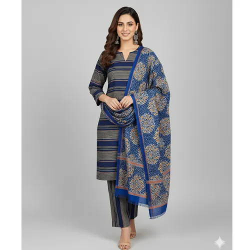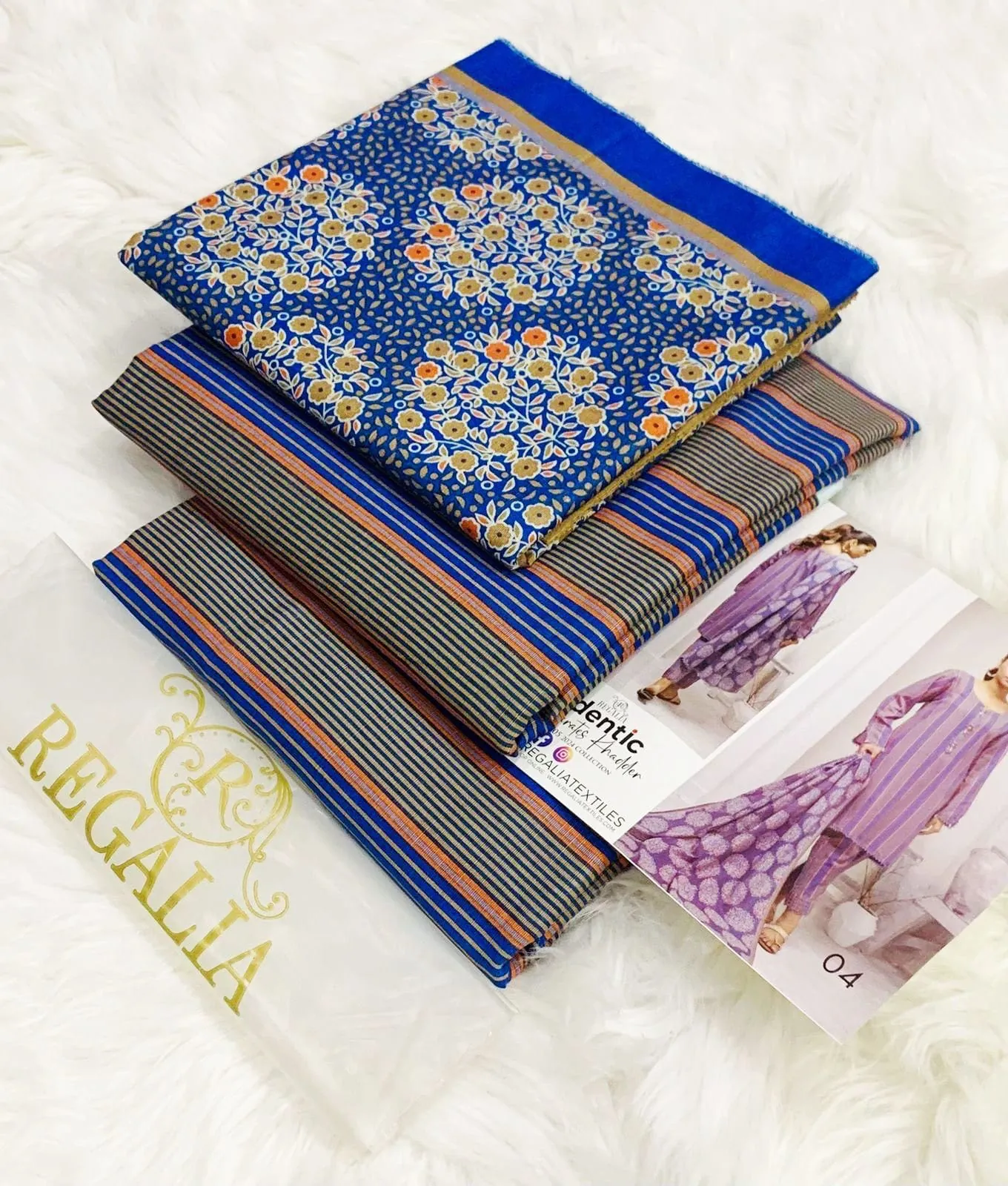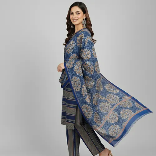 3pc Indigo Blue Striped Khaddar Suit with Intricate Printed Shawl | Winter Formal Collection