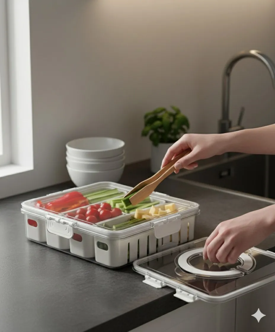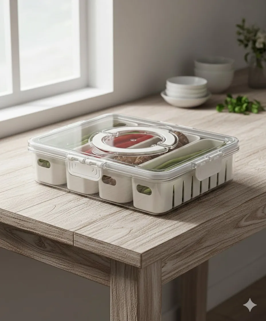 The crystal-clear outer bin provides 360° visibility, so you never forget what’s inside, while the reinforced locking clips and silicone seal ensure an airtight environment to prevent spoilage. Whether you're prepping snacks for the week or storing delicate berries and greens, the built-in drainage system keeps moisture away from your food, extending its shelf life significantly. The integrated fold-down handle makes it easy to transport from the fridge to the countertop for effortless meal prep.