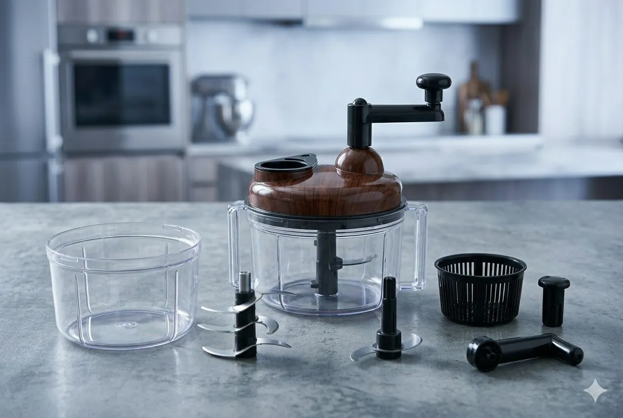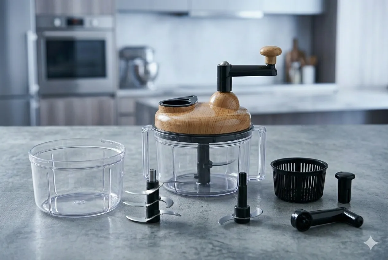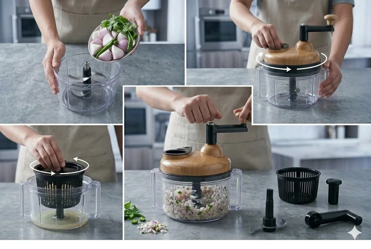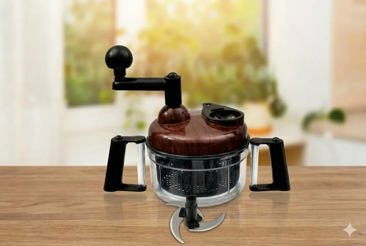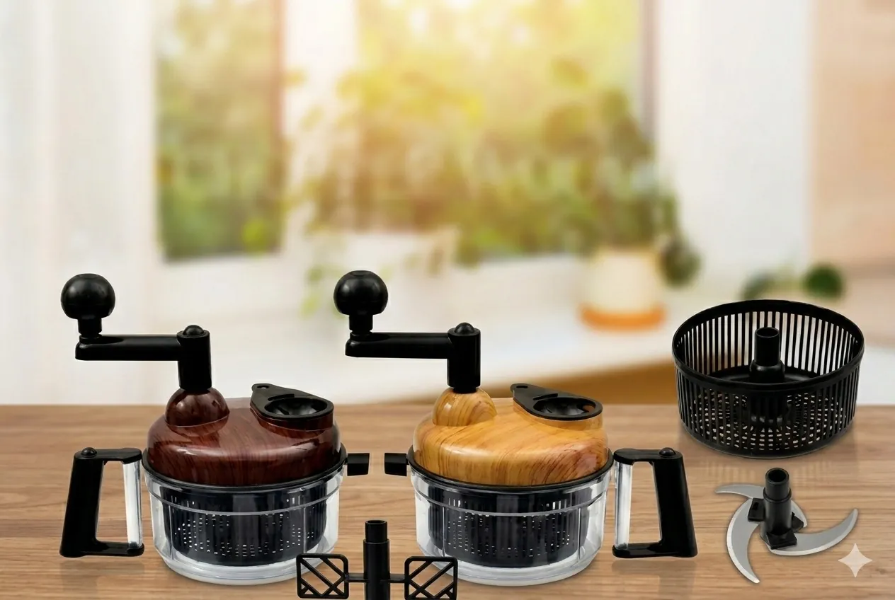 Upgrade your kitchen efficiency with the ultimate multi-functional manual food processor. This 4-in-1 tool is designed to replace several bulky appliances, serving as a high-speed vegetable chopper, a salad spinner, an egg whisker, and a meat mincer. The ergonomic hand-crank handle provides a smooth, high-torque rotation that makes quick work of onions, garlic, nuts, and even boneless meats. Whether you're preparing a fresh garden salad, whisking eggs for an omelet, or making homemade salsa, this processor offers precision control over your food's texture. Its compact, cordless design makes it an essential companion for small kitchens, RVs, and camping trips.Effortlessly chop, mix, and dry your favorite ingredients with this versatile 4-in-1 manual food processor. Featuring a powerful hand-crank mechanism and sharp stainless steel blades, it’s the perfect eco-friendly solution for meal prep without the need for electricity.