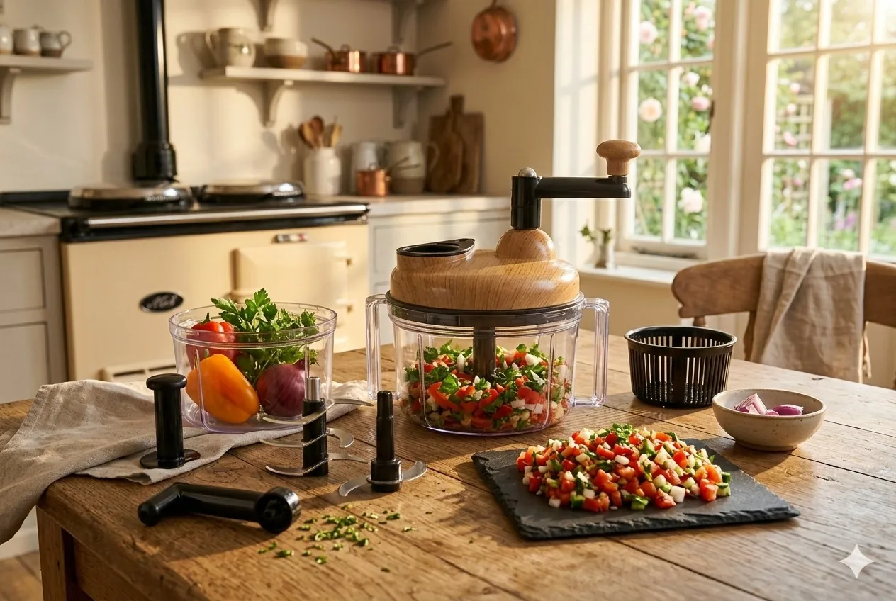 4-in-1 Manual Hand Crank Food Processor & Vegetable Chopper | 1.5L Salad Spinner, Meat Mincer, Egg Whisk & Blender with Stainless Steel Blades | Non-Electric Kitchen Gadget for Travel & Camping