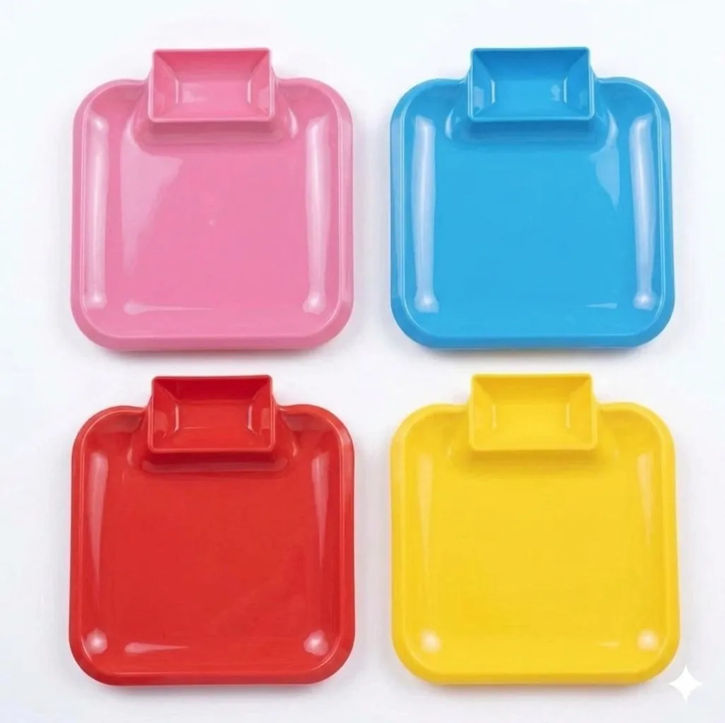 4-Piece Vibrant Square Plastic Dipping Plates Set – Colorful Reusable Snack Trays with Built-in Sauce Compartment – BPA-Free Sushi & Appetizer Servers (Pink, Blue, Red, Yellow)