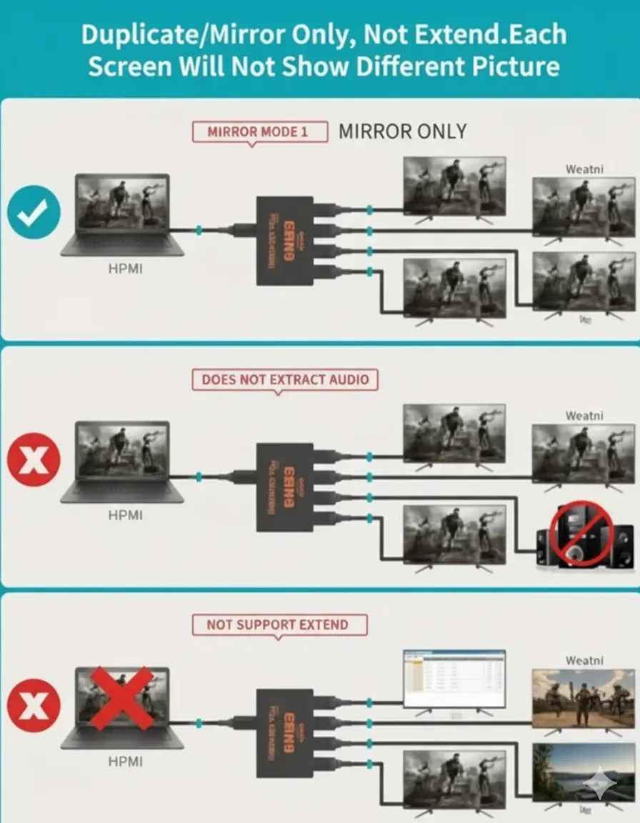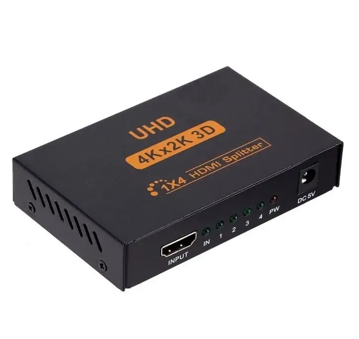 Upgrade your visual setup with this powerful 4K HDMI Splitter 1x4. It allows you to take one HDMI source, such as a gaming console, Blu-ray player, or PC, and simultaneously display its content on four different screens. It seamlessly supports Full Ultra HD 4K30Hz and 1080p resolutions, ensuring a sharp and clear picture on every display. This splitter is ideal for digital signage, sports bars, retail showrooms, or multi-screen gaming setups where you need reliable, high-quality signal distribution. For an immersive experience, it handles advanced digital audio formats like DTS-HD and LPCM 7.1-channel sound.Setting up the splitter is incredibly simple, requiring no extra software or drivers—it's truly Plug & Play. Its robust metal casing ensures long-term durability and provides superior heat dissipation to keep the device running cool and reliably, unlike plastic alternatives. The compact design allows for easy integration into any space. Furthermore, the splitter is HDCP 1.3 compliant, which ensures your copyrighted content plays correctly and securely on all connected screens.