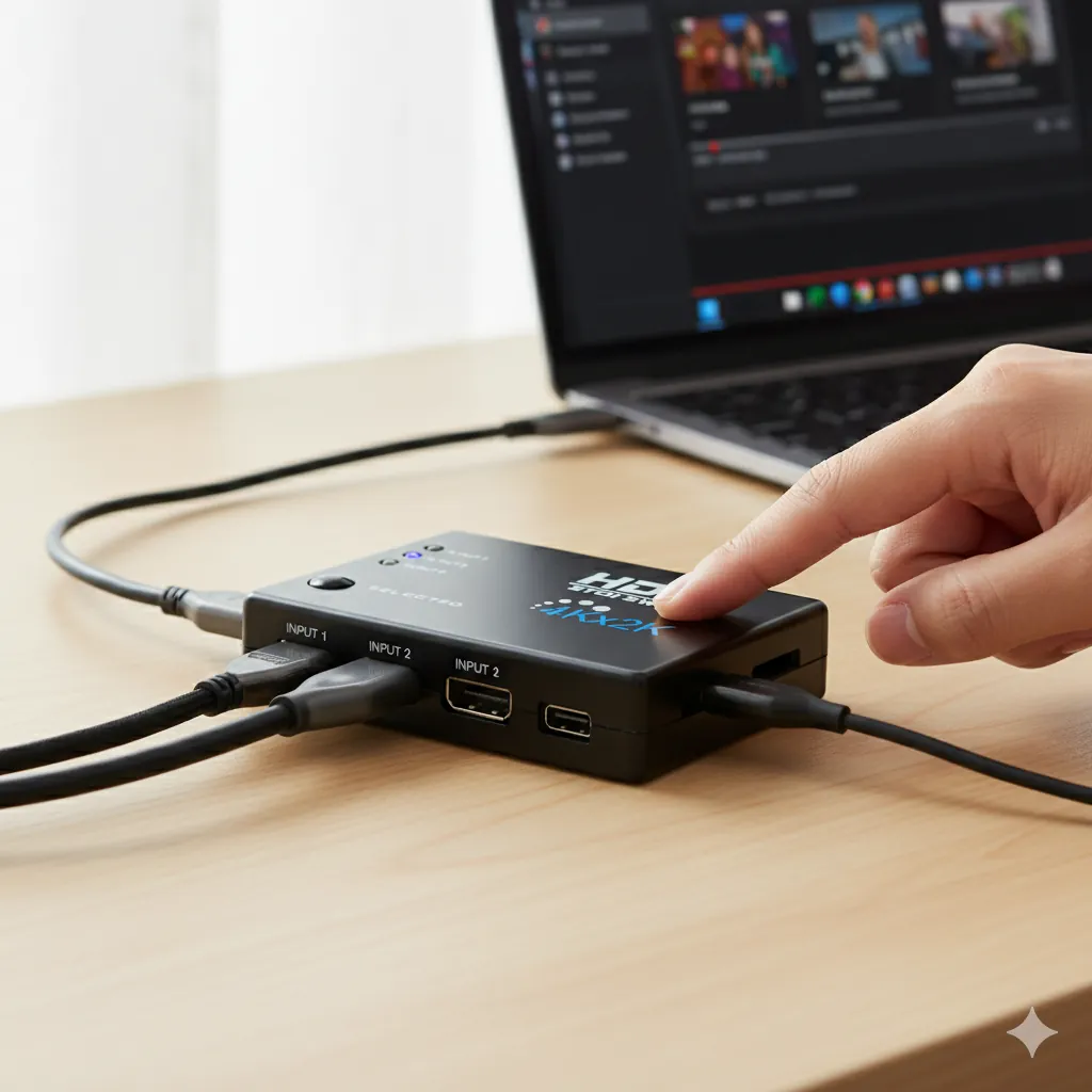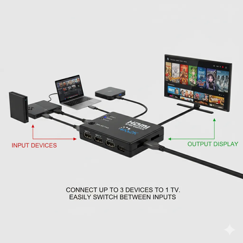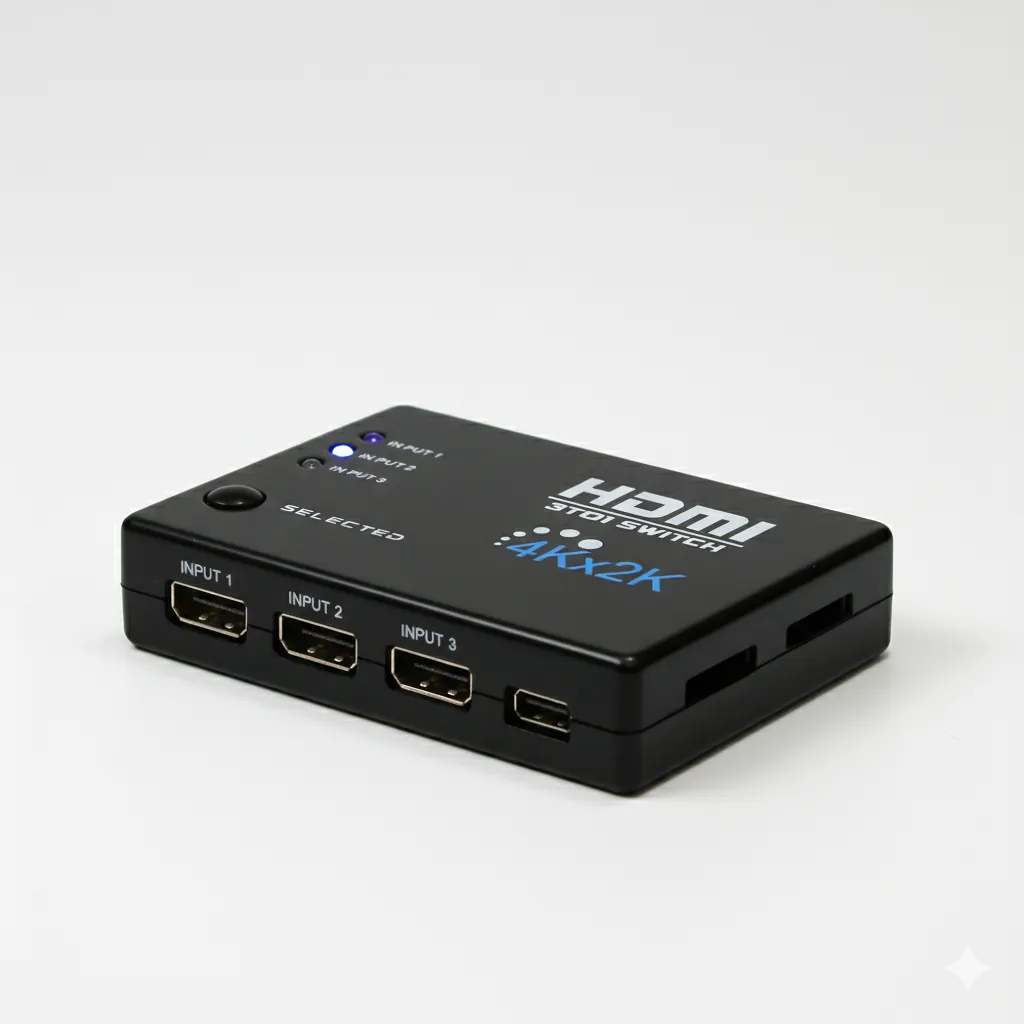 This 3-Port HDMI Switch is the perfect solution for anyone with multiple media devices and a TV with limited HDMI inputs. It allows you to connect up to three different source devices—such as a gaming console (PS5, Xbox), Blu-ray player, or streaming box (Roku, Apple TV)—to one HDMI port on your display. Designed to support modern video standards, this switch is 4K Ultra HD (4Kx2K) and Full HD 1080P compatible, ensuring that you experience your favorite movies and games with maximum visual fidelity. The robust build and intelligent chip ensure a stable, high-speed 18Gbps data transmission without any lag or distortion, maintaining the quality of your picture and sound. The front-panel manual selector button makes switching between your connected devices quick and easy, with clear LED indicators showing the active input.