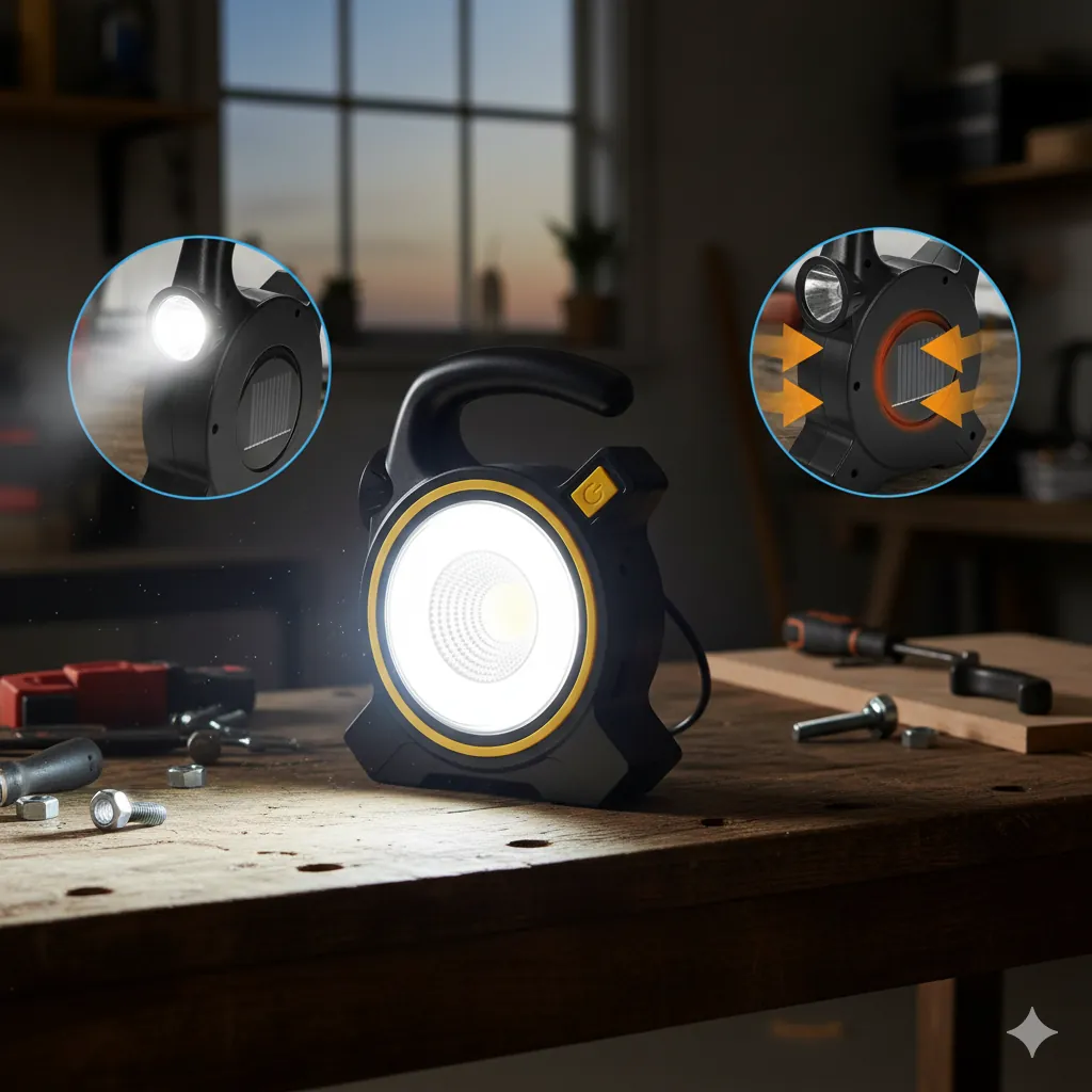 This 50W Portable Solar LED Work Light is engineered for maximum versatility and durability. It provides powerful Cool White (6500K) illumination with multiple lighting modes, ensuring the right amount of light for any task. The light features a robust, IP65-rated body made from a combination of ABS plastic and Aluminum with rubberized handles for a secure, non-slip grip.