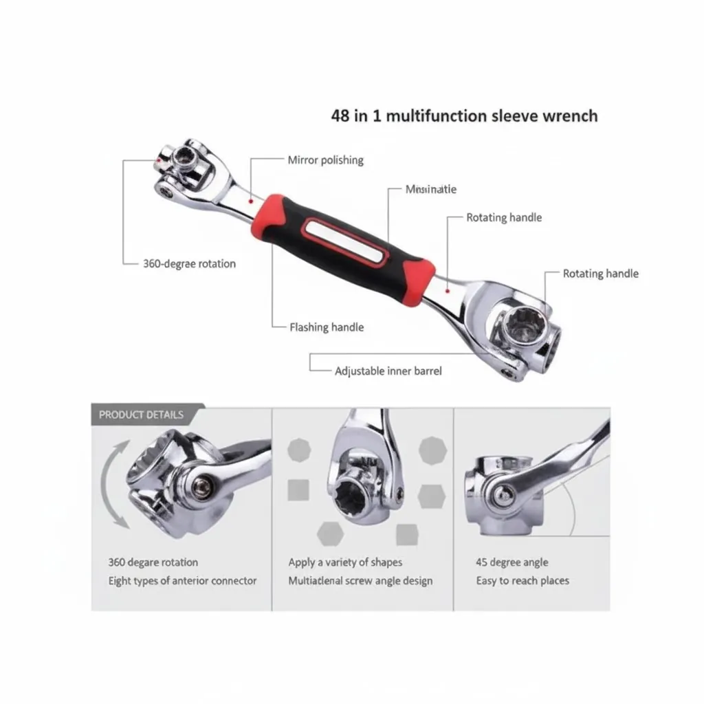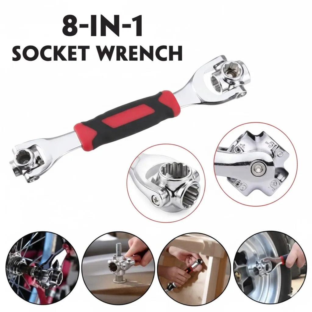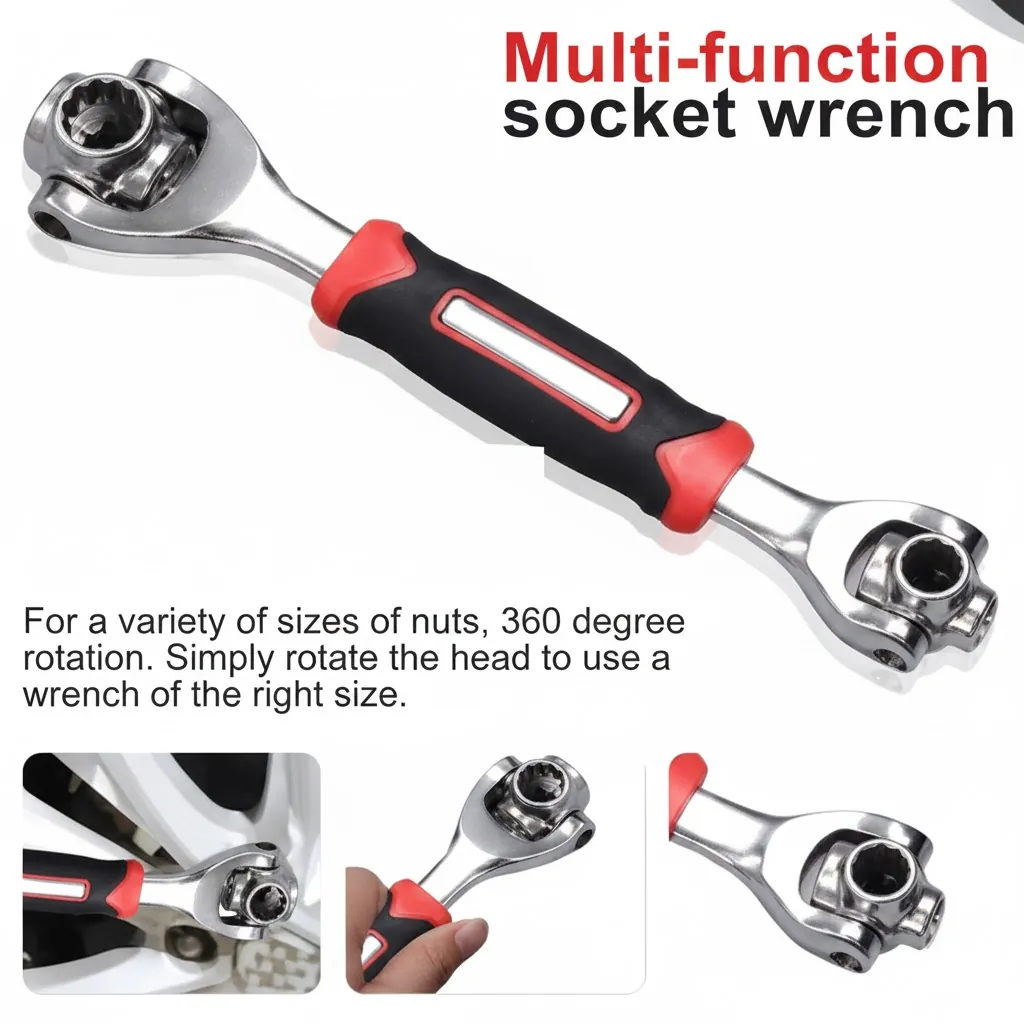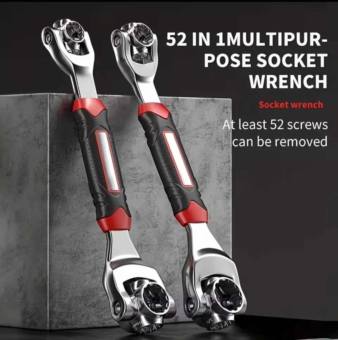 Ditch the heavy toolbox and simplify your repairs with the 52-in-1 (or 48-in-1) Multi-Purpose Socket Wrench. This versatile 'Tiger Wrench' features a 360-degree rotating head that instantly adjusts to fit 8 standard and metric socket sizes on each end (up to 48 or 52 types of screws/bolts depending on the model). The durable chrome-plated steel construction and ergonomic, non-slip rubber handle make it easy to tackle any task—from automotive work and bike repair to home DIY projects and plumbing. Get maximum versatility and leverage in one compact, time-saving tool.