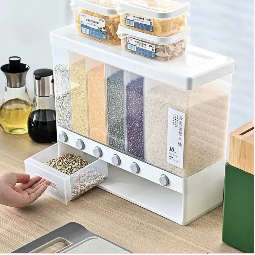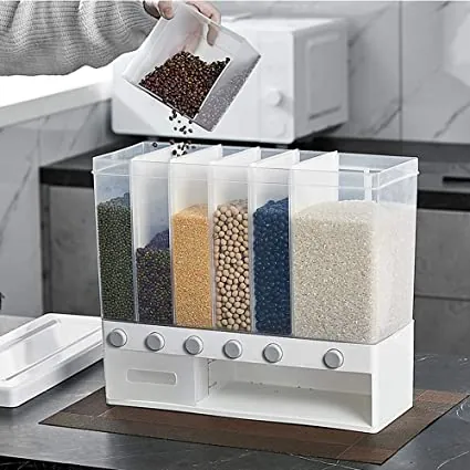 The 6 in 1 Cereal Dispenser is a versatile dry food storage solution that keeps your kitchen perfectly organized. With six separate compartments, it allows you to store cereals, rice, lentils, beans, sugar, nuts, snacks, and more—all in one dispenser. Its wall-mounted design saves counter space while keeping ingredients easily accessible. Each section has a smooth press-to-release mechanism for controlled pouring without mess. Made from high-quality, durable material, it keeps food fresh and protected from moisture. Ideal for modern kitchens looking for convenience, hygiene, and stylish organization.