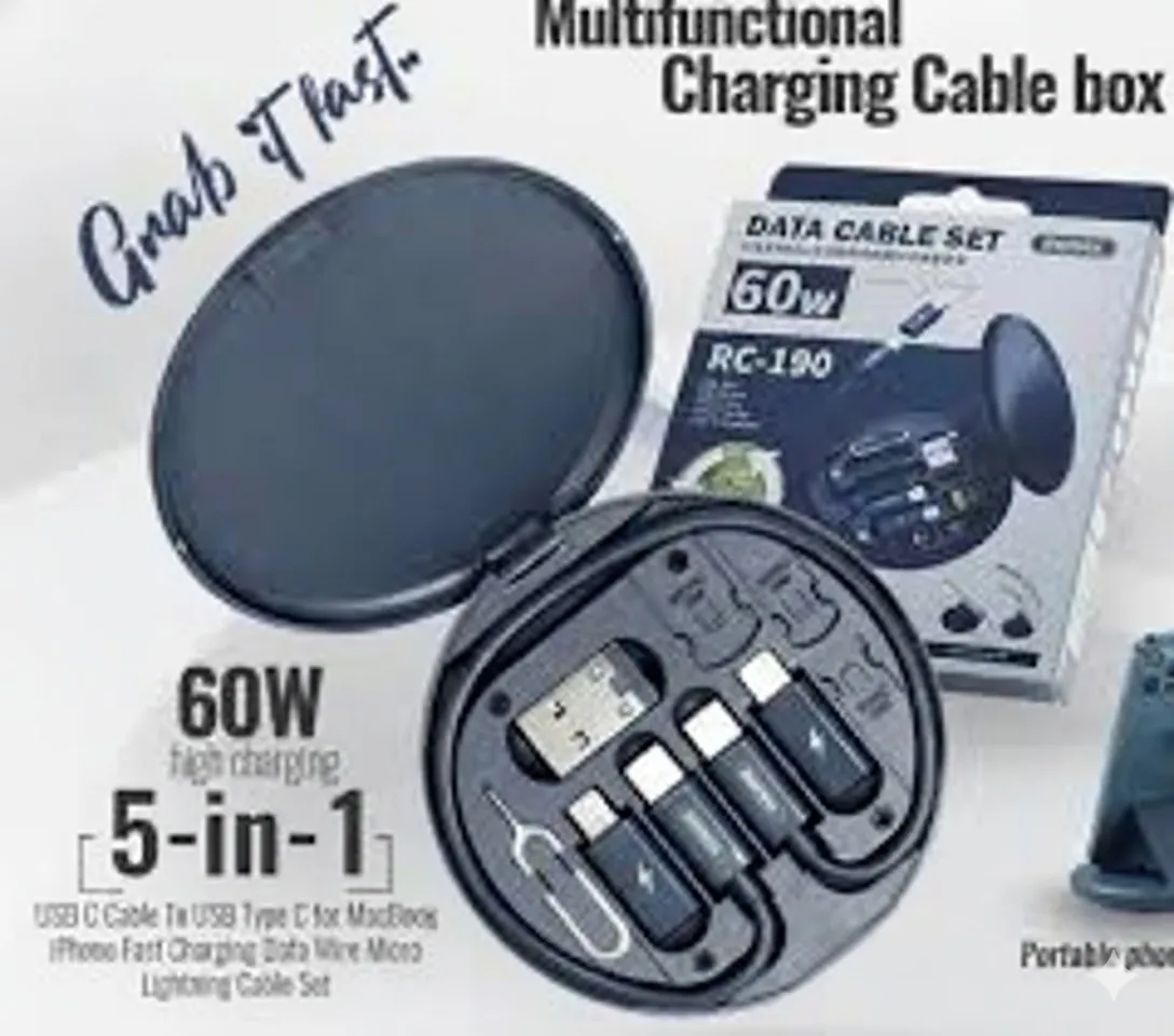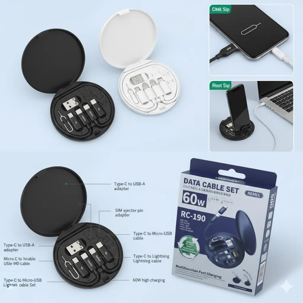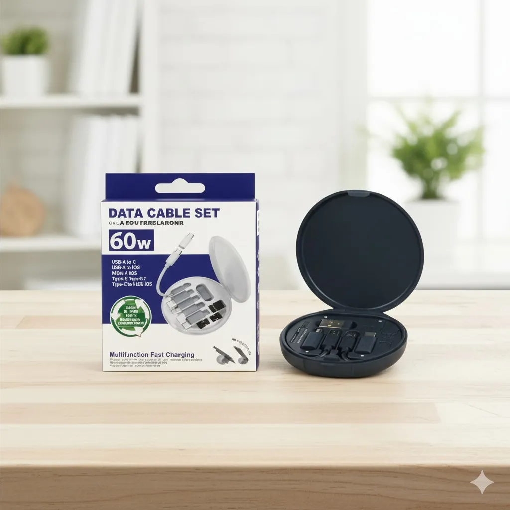 Simplify your charging and data transfer needs with the powerful 60W Multifunction Data Cable Set. This innovative kit is designed to eliminate cable clutter and ensure you have the right connection for any device, anywhere in the world. The central component is a USB-C to USB-C cable, which supports 60W Power Delivery (PD) fast charging for laptops, tablets, and smartphones.