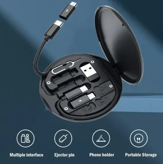 This means you can easily create connections like USB to iPhone, Type C to Micro USB, or USB to Type C. Everything is stored inside a sleek, circular protective carrying case which also acts as a cable winder/organizer. The case also thoughtfully includes a SIM ejector pin and storage slots for SIM cards, making it an essential companion for international travelers. Whether you need fast charging, data transfer, or international connectivity tools, this compact set has you covered.