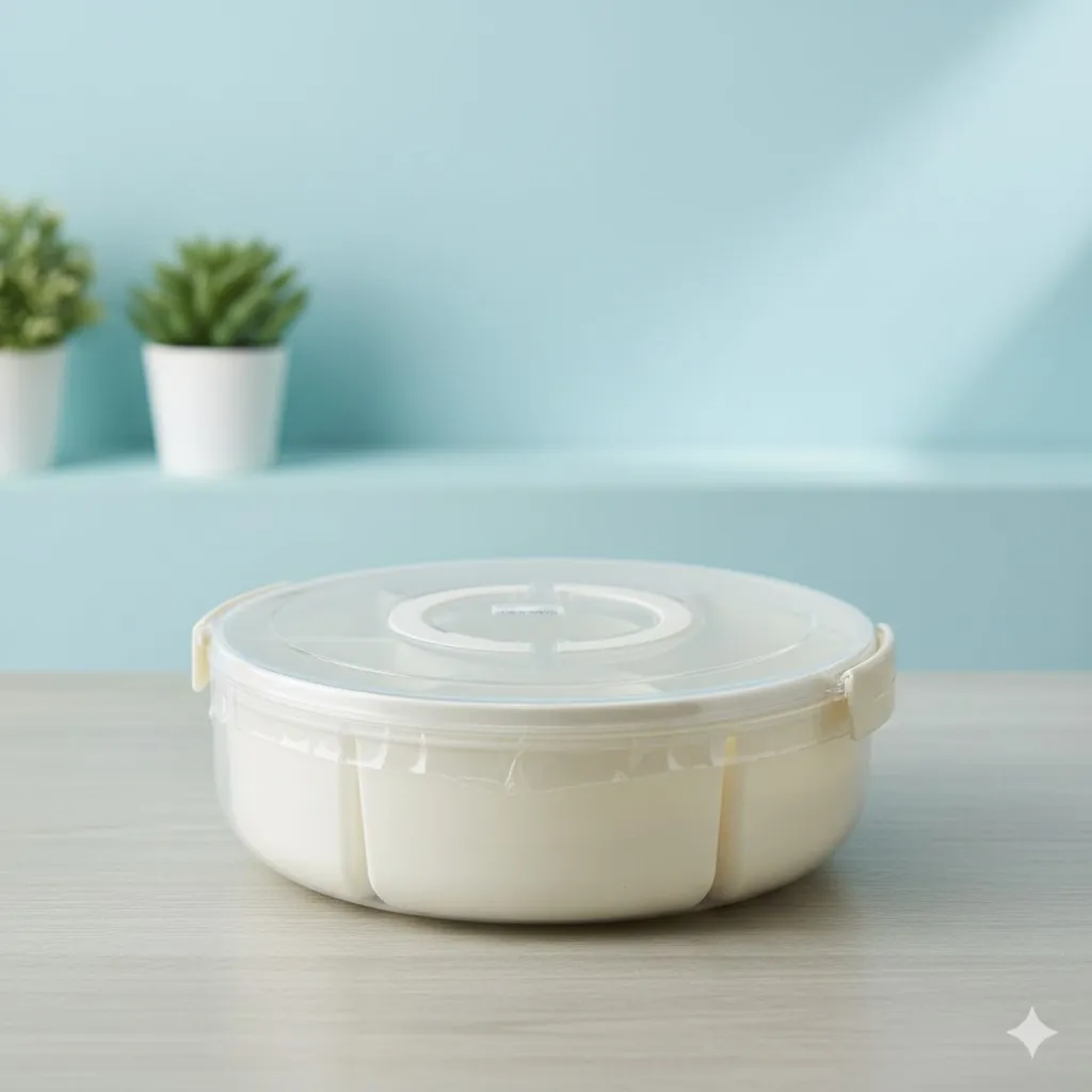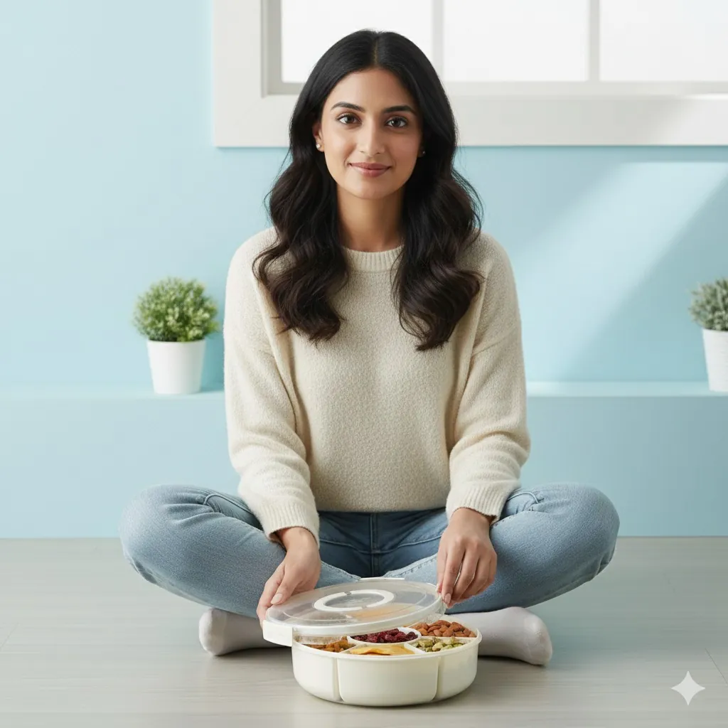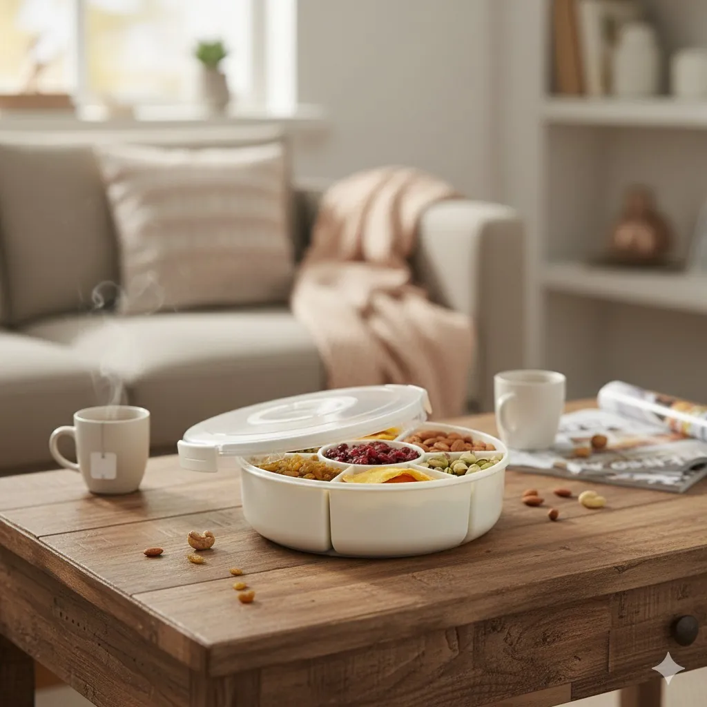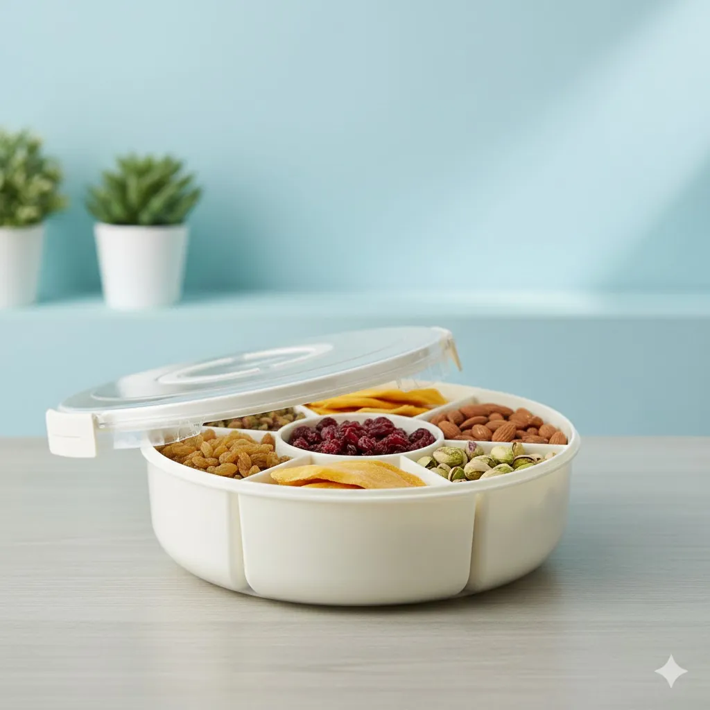 The 360-degree rotating base ensures that every guest can reach their favorite treat without moving the entire tray. Each of the seven sections is deep enough to hold ample portions, while the transparent airtight lid provides a crystal-clear view of the contents while locking out moisture and dust to preserve crunch and flavor. Whether you're using it as a festive serving platter or a daily "Masala Box," its durable, BPA-free construction ensures long-lasting safety and hygiene.