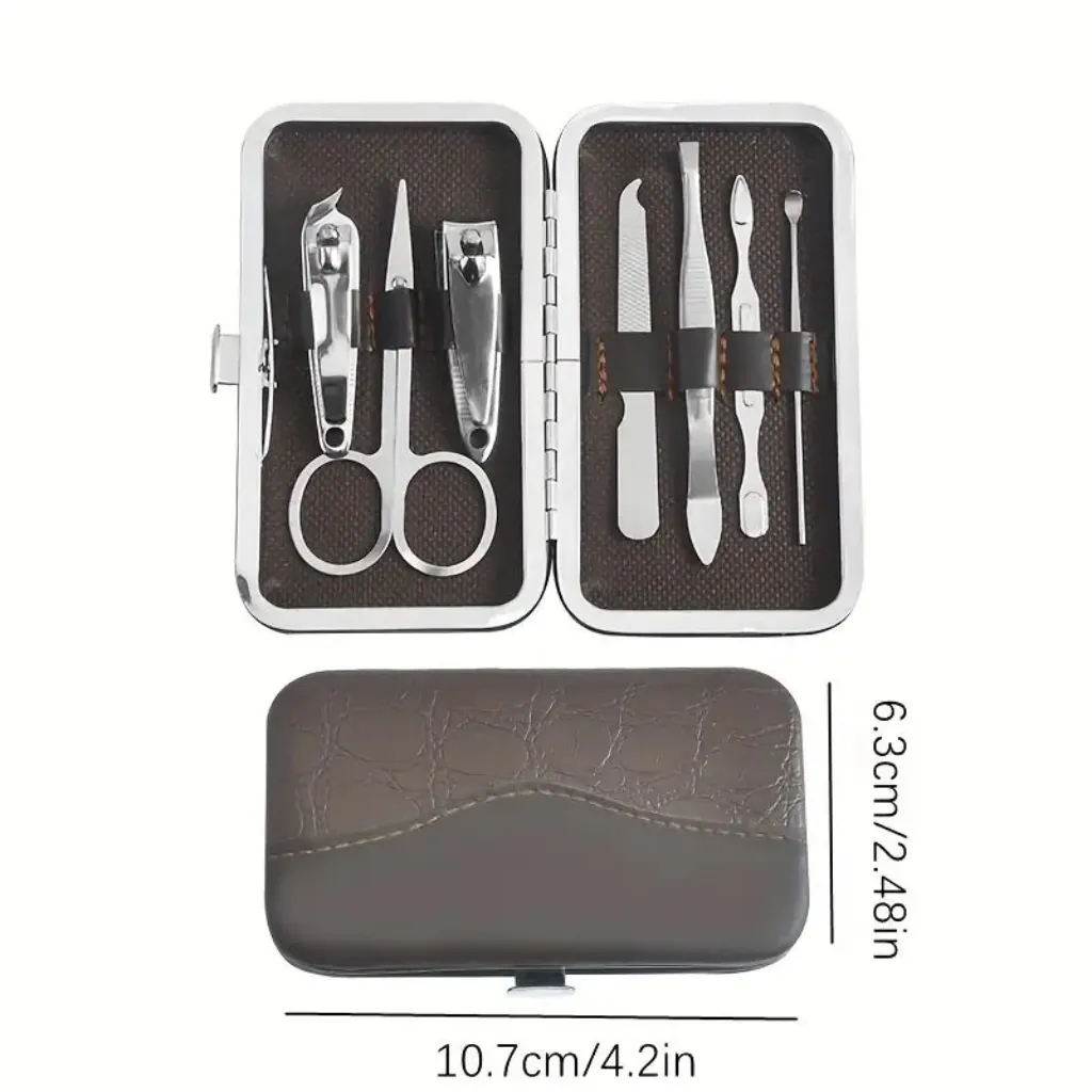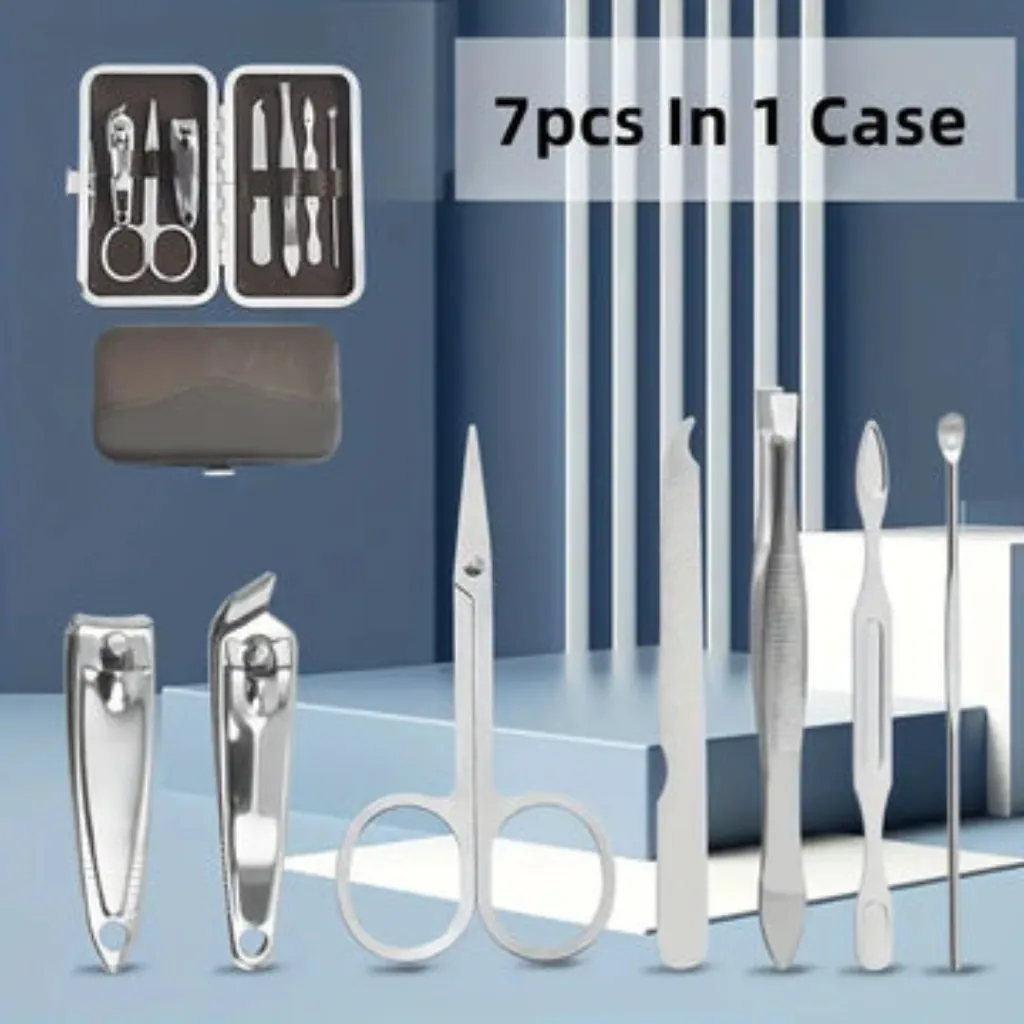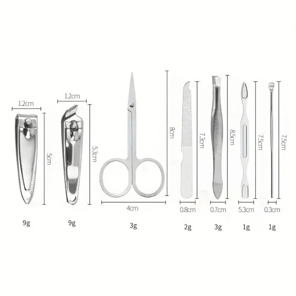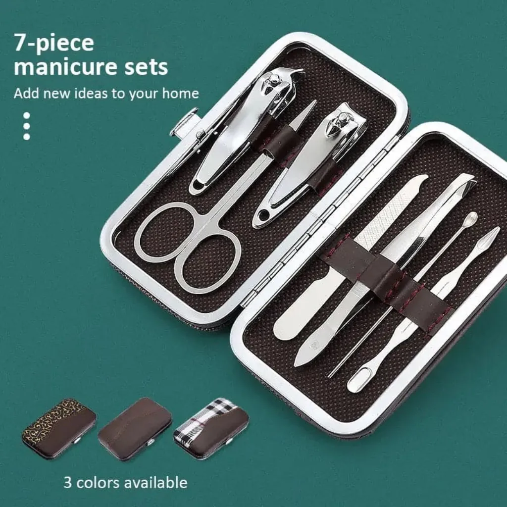 Keep your nails in perfect condition with our comprehensive 7-in-1 Manicure & Pedicure Grooming Set. This kit includes all the essential tools you need for professional-quality nail care at home or on the go, including nail clippers, scissors, cuticle pushers, and a nail file. Each tool is crafted from high-quality stainless steel for durability and precision. The entire set comes housed in a sleek, portable case, making it easy to store, organize, and carry in your bag or luggage. It's the perfect gift for yourself or a loved one who values personal grooming.