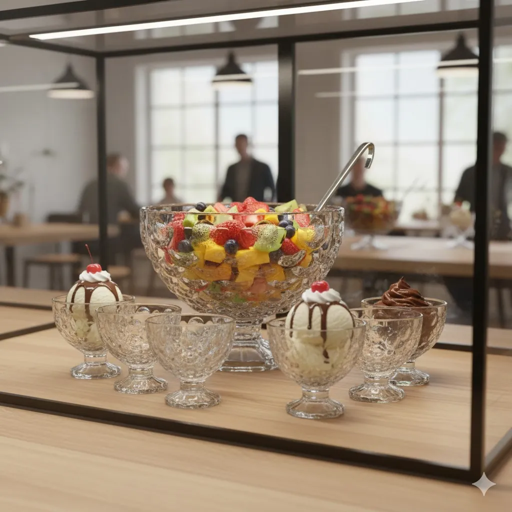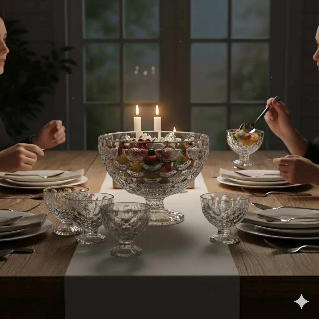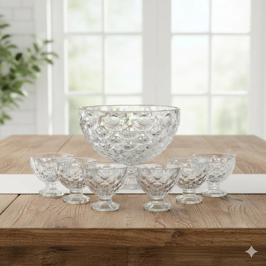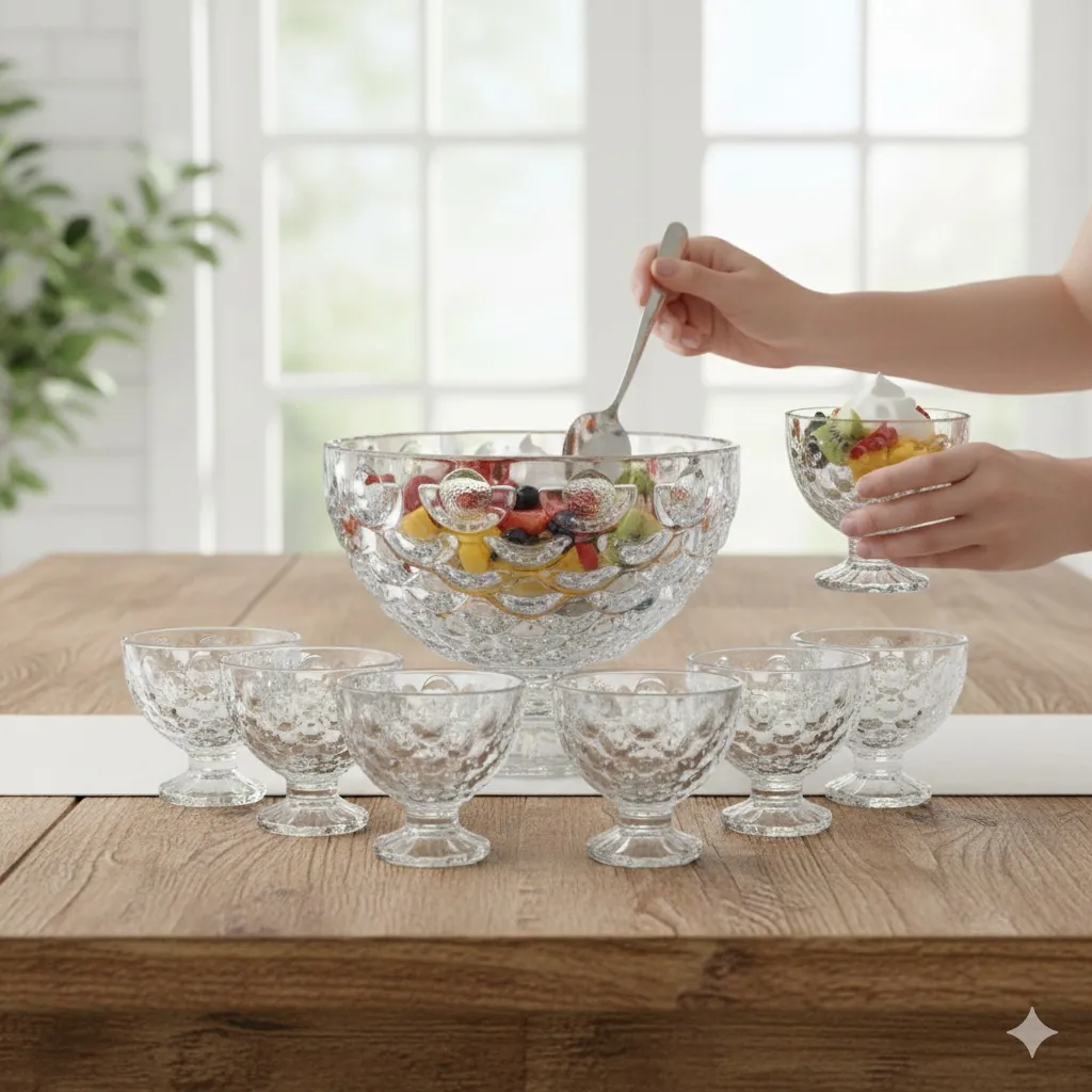 Add a sparkle to your next gathering with our 7-Piece Premium Glass Dessert & Trifle Set. Crafted from high-quality, lead-free glass, this set features a stunning "bubble" textured pattern that catches the light beautifully, giving it a luxurious crystal-look finish. The set includes one oversized master bowl, ideal for centerpiece desserts like English trifles or large fruit salads, and six perfectly sized matching cups for individual portions. Whether you're hosting a formal dinner party, a bridal shower, or a casual family Sunday, this durable yet stylish glassware set provides the perfect presentation for your culinary creations. Its classic scalloped edges and textured exterior offer an easy-grip surface and a timeless aesthetic that complements any kitchen decor. Elevate your table setting with this elegant 7-piece glass dessert set. Featuring a large 8-inch serving bowl and six matching individual cups, this set is perfect for serving trifles, fruit salads, puddings, or ice cream with a touch of sophisticated vintage style.