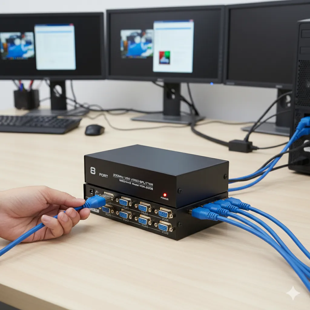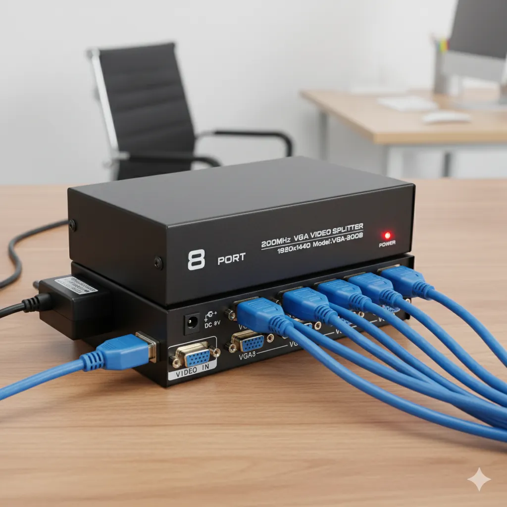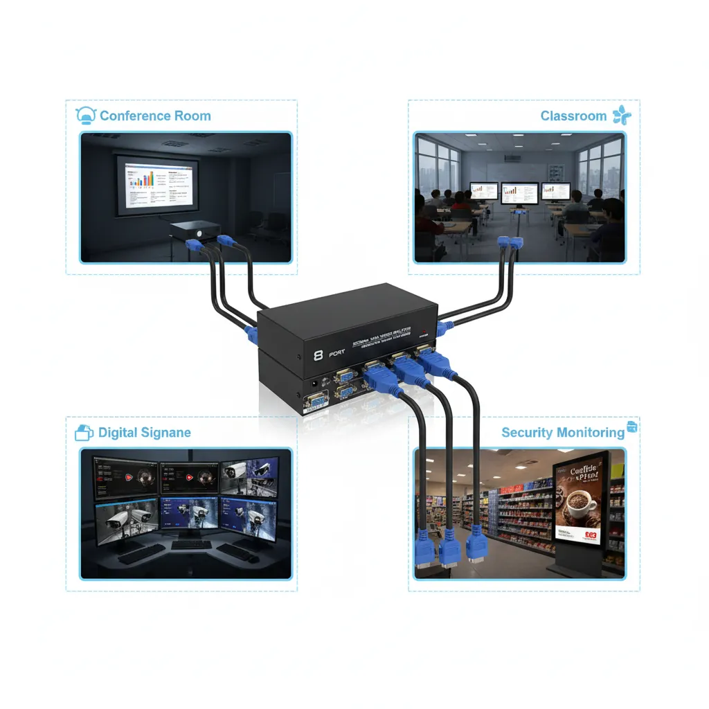 The VGA Splitter 8 Port 200 MHz is a professional-grade solution for distributing video content from one source to multiple displays. It takes the single VGA input from your computer or laptop and reliably outputs the identical signal to eight VGA-enabled monitors or projectors. The robust 200 MHz video bandwidth ensures exceptional video integrity and clarity, even when transmitting high resolutions like 1920 x 1440.This device is essential for environments requiring simultaneous display, such as lecture halls, command centers, and retail stores, allowing you to extend your video signal up to 65 meters (210 feet) without degradation. Its compact and sturdy design guarantees long-term durability and easy integration into any setup.