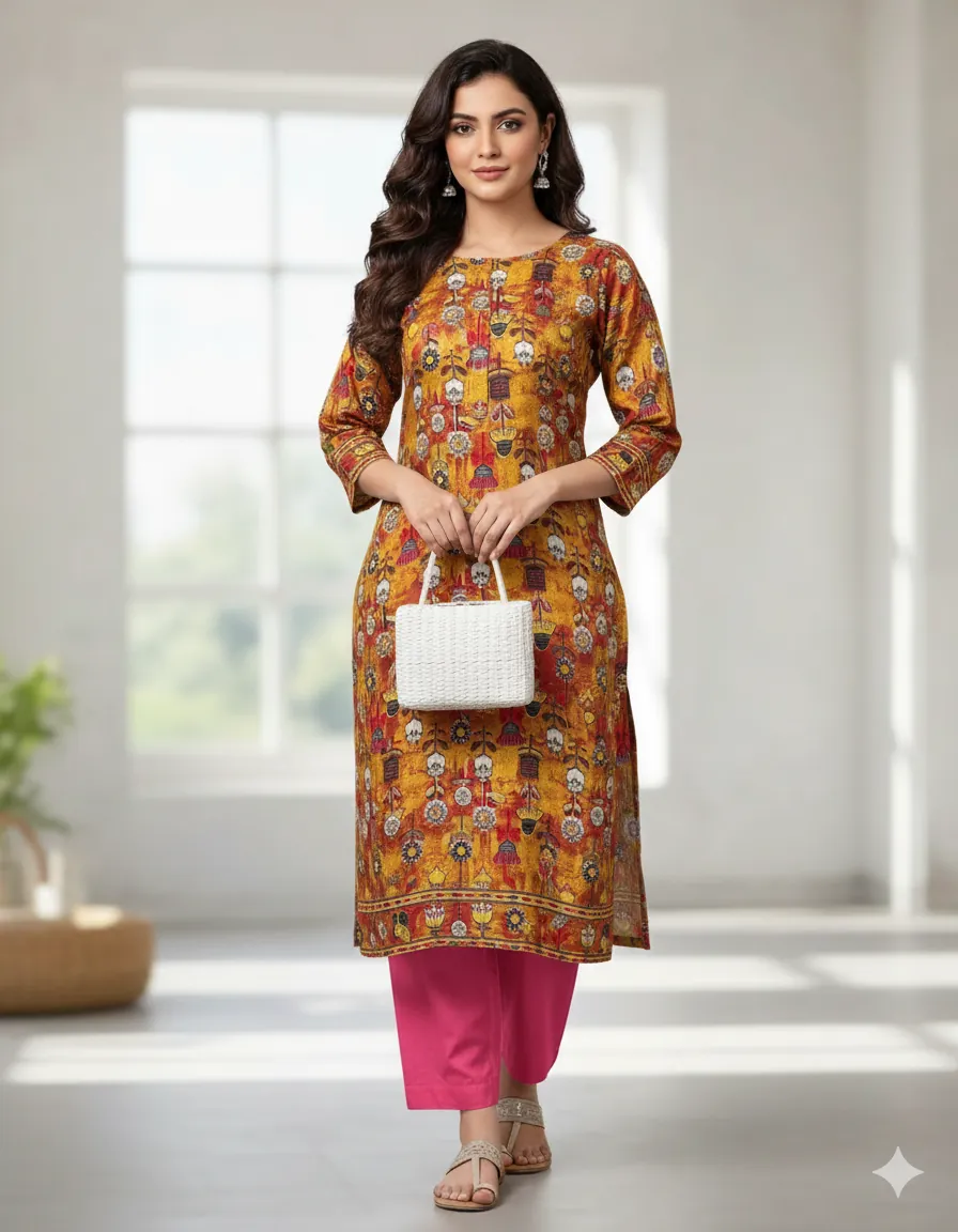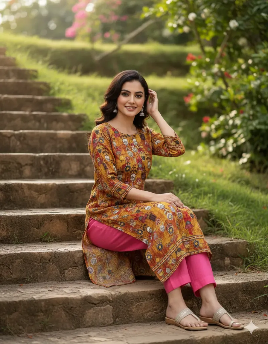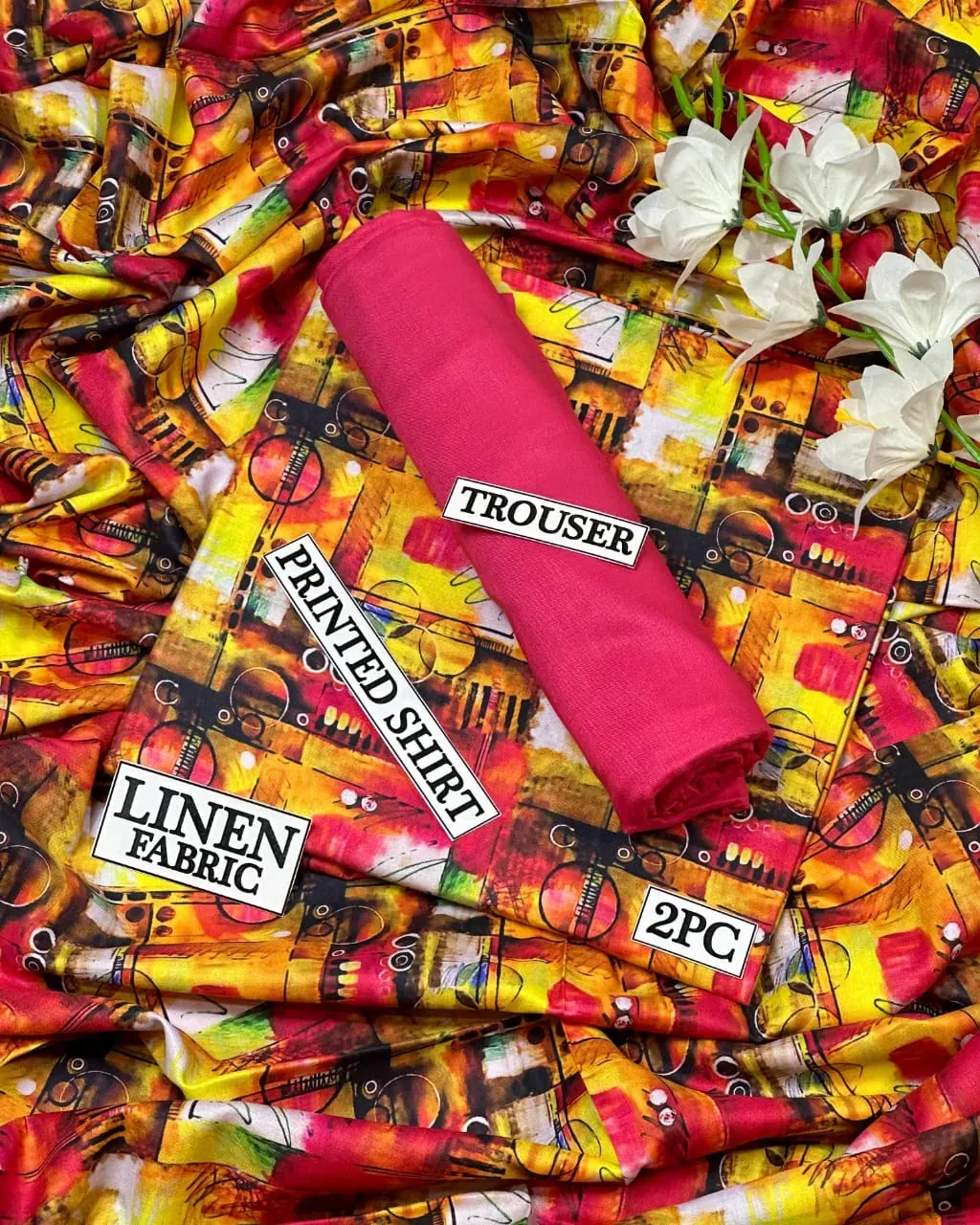 Unleash your inner artist with this captivating 2-piece unstitched linen suit. The set includes a digitally printed linen shirt boasting a dynamic abstract art design, rich with splashes of red, yellow, orange, and black, creating a visually striking and modern aesthetic. This expressive print is perfectly paired with a plain, solid pink linen trouser, adding a vibrant and cohesive touch to the ensemble. Crafted from high-quality, breathable linen fabric, this suit offers both comfort and a unique style statement, making it perfect for those who dare to stand out. Customize the fit and create an outfit that truly reflects your artistic flair.