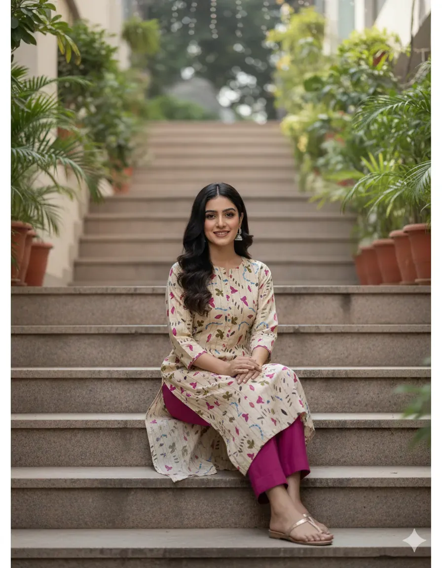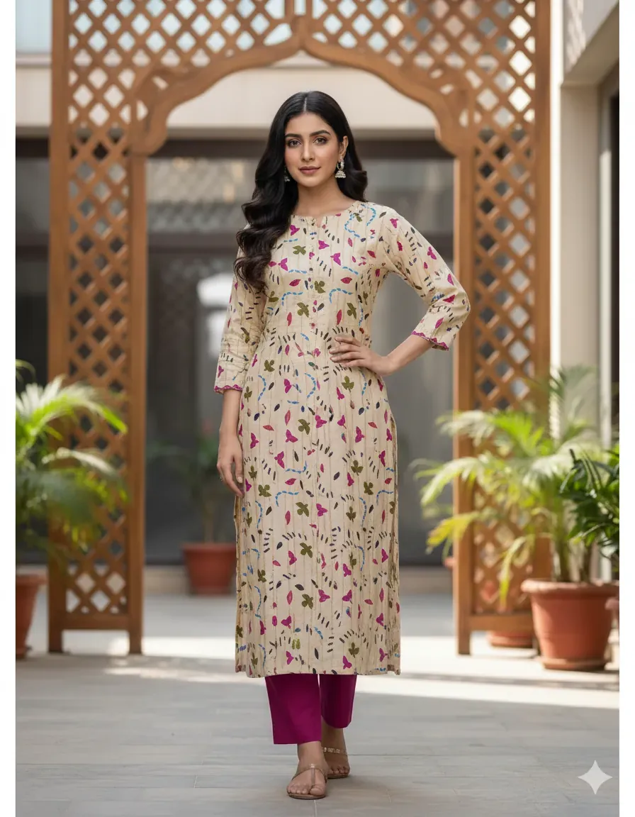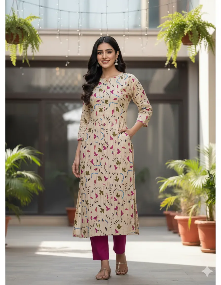 Embrace playful sophistication with this delightful 2-piece unstitched linen suit. The set includes a digitally printed linen shirt boasting a unique abstract pattern of stylized leaves, curves, and strokes in shades of blue, magenta, and green, set against a soft, creamy beige background. This artistic design is perfectly complemented by a plain, rich magenta linen trouser, adding a pop of vibrant color. Made from breathable and comfortable linen fabric, this suit is an excellent choice for everyday wear or casual outings. Tailor it to your personal style for a truly customized ensemble.