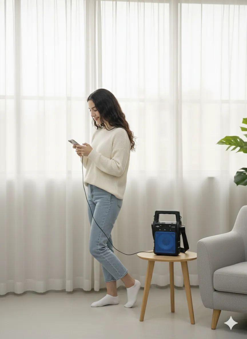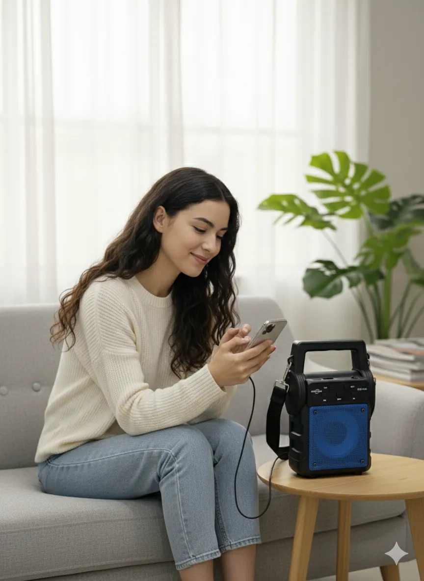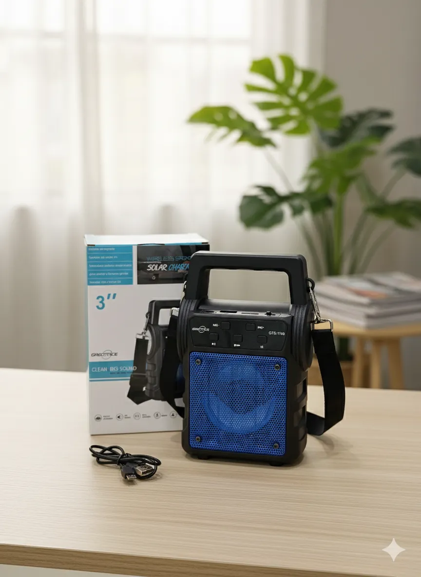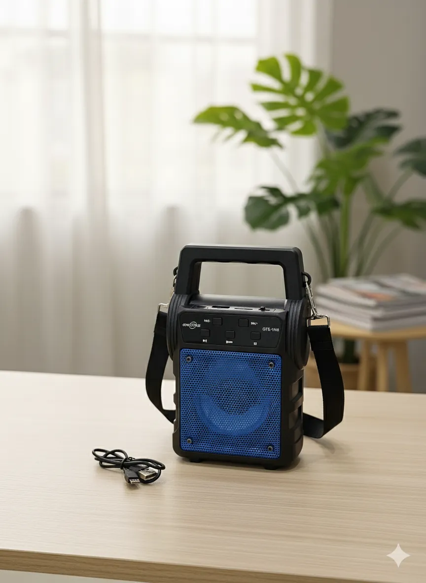 Experience your music in style with the Acoustic Wave QTS-1668 Portable Speaker. This all-in-one device delivers clear, robust audio through its striking blue speaker grille. Its compact, cube-like design includes an integrated top handle and a detachable shoulder strap, making it incredibly easy to take anywhere—from your living room to a picnic in the park.