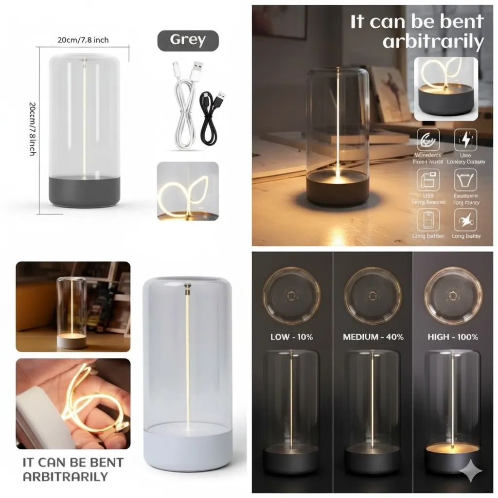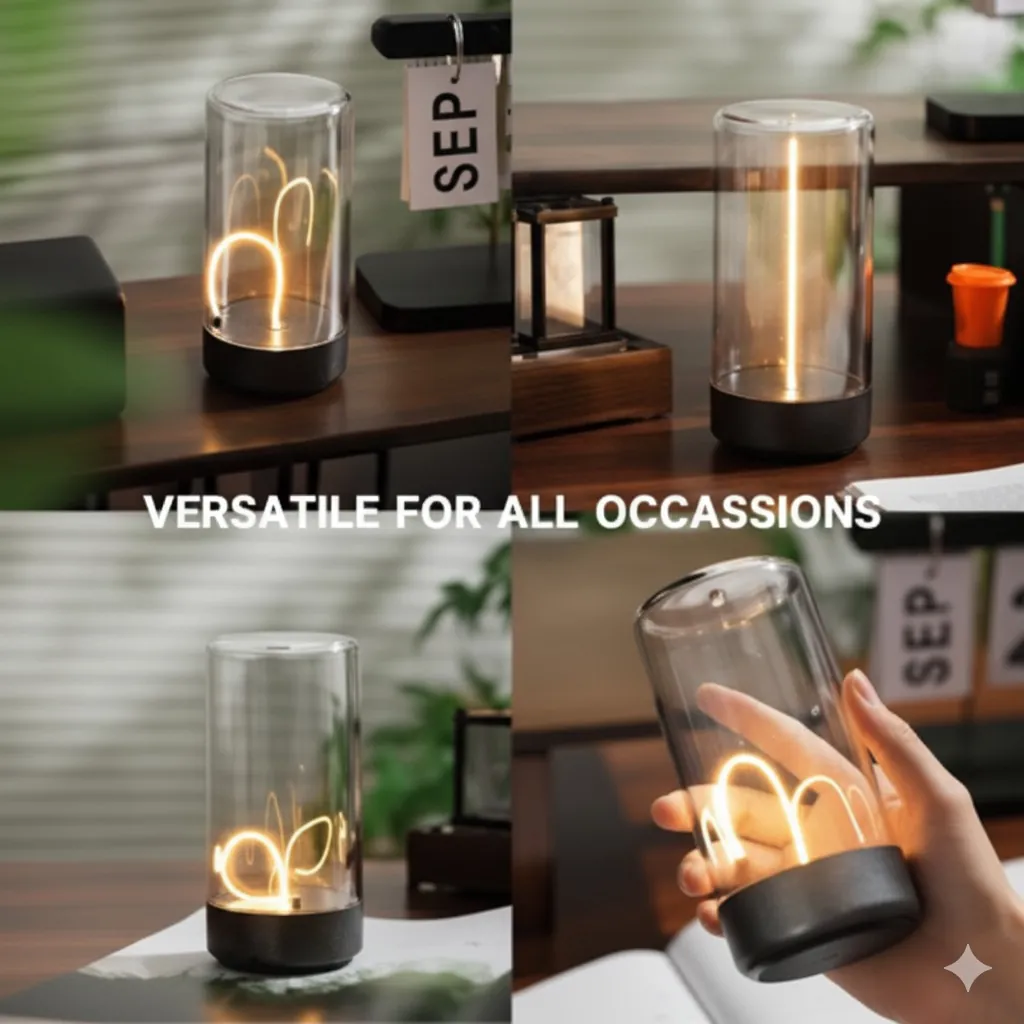 Illuminate your space with the Modern Decorative LED Desk Lamp, a piece designed for those who appreciate aesthetic lighting. This lamp features a striking unique LED filament encased within a sleek, smoked or clear glass cylinder, giving the appearance of floating light. Its minimalist design makes it Versatile for All Occasions, whether used as a soft night light in the bedroom, an artistic accent on your office desk, or a centerpiece for mood setting.
