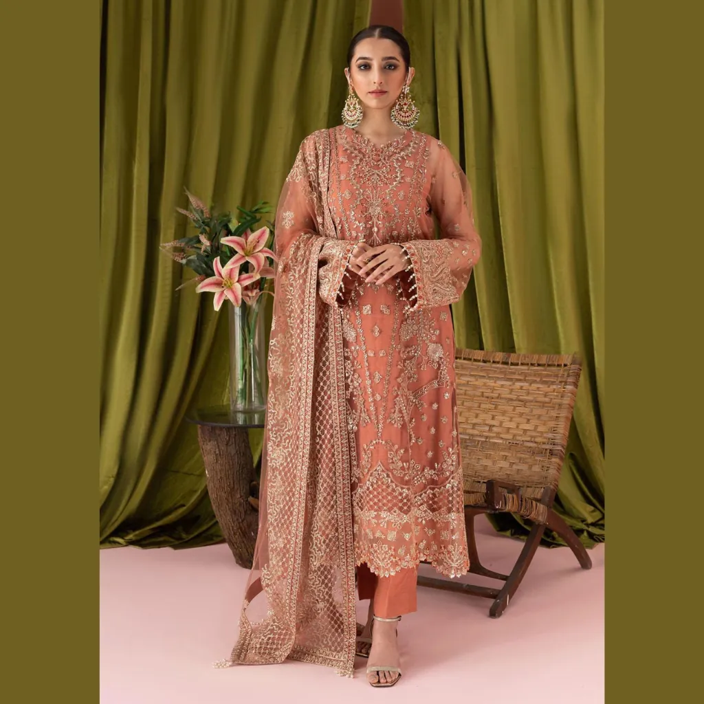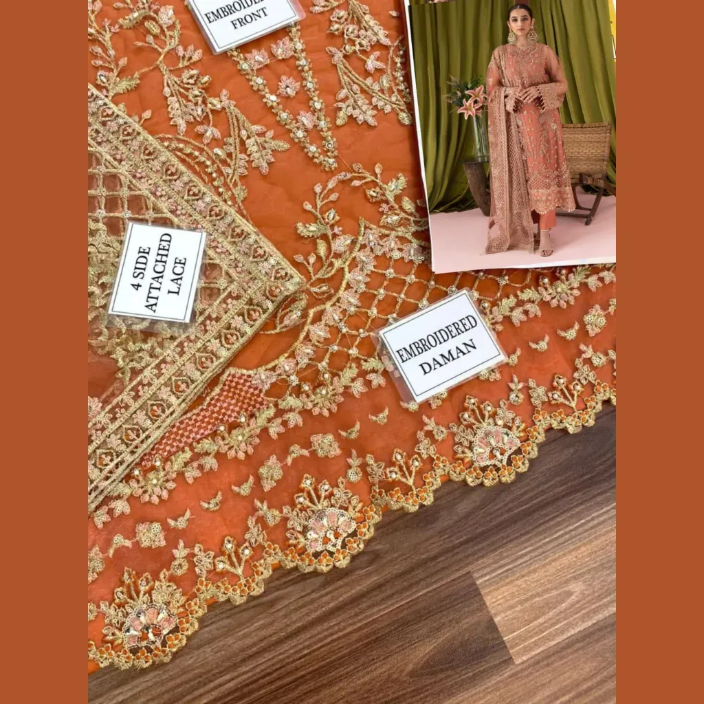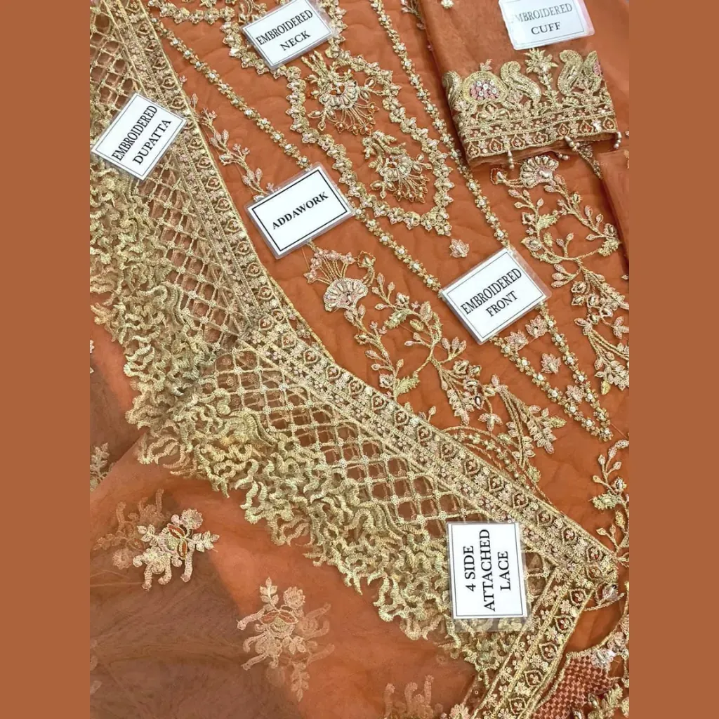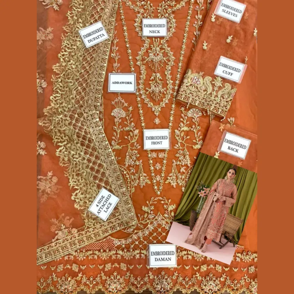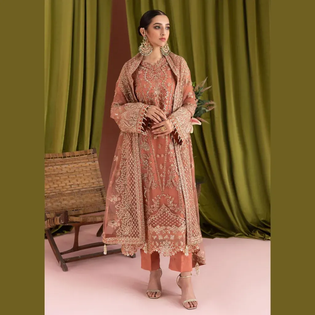 The embroidered sleeves with cuff patch and attached tassels add a touch of modern elegance, while the fully embroidered net back completes the premium look. Paired with a soft plain malai trouser and a ready-to-wear embroidered net dupatta, this dress is the ultimate choice for weddings, receptions, and festive events.