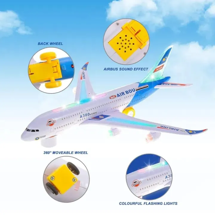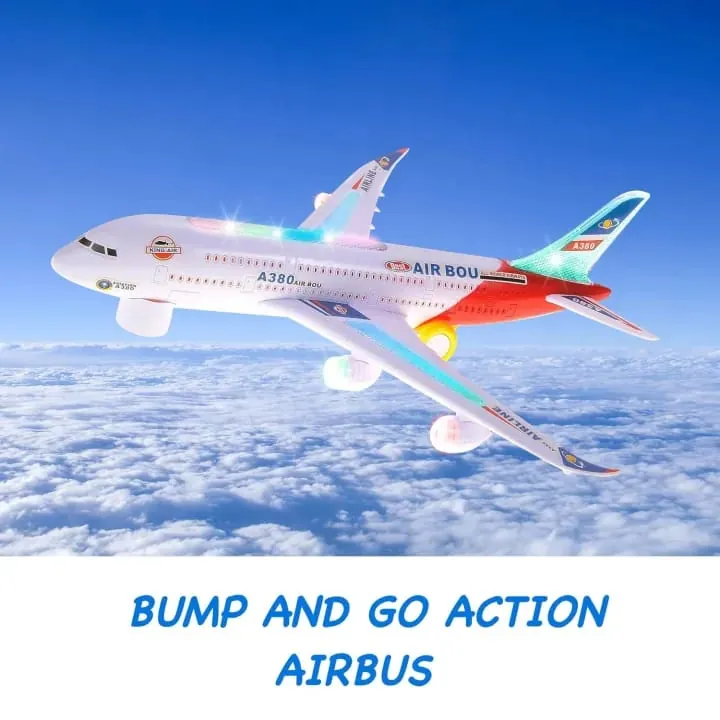 Bring excitement and adventure to your child’s playtime with this Airplane Toy With Lights and Music. Modeled after the Airbus A380, this toy features bright flashing LED lights and fun sound effects, creating an engaging and realistic flying experience. The toy is battery-operated, safe for children, and built from durable plastic, making it both entertaining and long-lasting.Its electric bump-and-go action allows it to change direction automatically when it hits an obstacle, ensuring non-stop fun. The toy helps stimulate children’s imagination, creativity, and love for aviation. Perfect as a gift for birthdays, holidays, or just everyday fun.