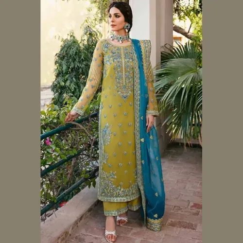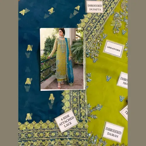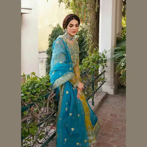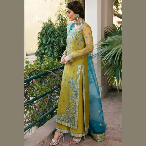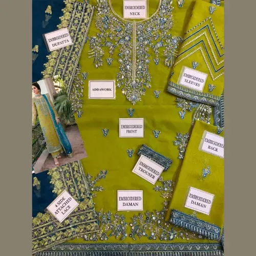 The ensemble is paired with a plain malai trouser adorned with an embroidered border for a graceful balance. A ready-to-wear organza dupatta, beautifully embellished with sequence embroidery, ties the outfit together, making it the perfect choice for festive gatherings, weddings, or any special celebration. This unstitched formal set allows for tailored styling, ensuring a flawless fit and timeless sophistication.