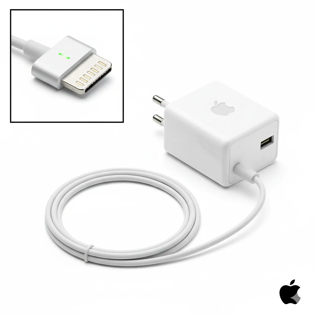 APPLE 45W MAGSAFE 2 Power adapter designed for MacBook Air models, featuring a magnetic DC connector for easy and secure attachment, along with an LED indicator to show charging status. The adapter is compact and travel-friendly, with a design that lets you neatly wrap the DC cable around it. This makes it a convenient accessory for keeping your MacBook charged whether it's powered on, off, or in sleep mode.
