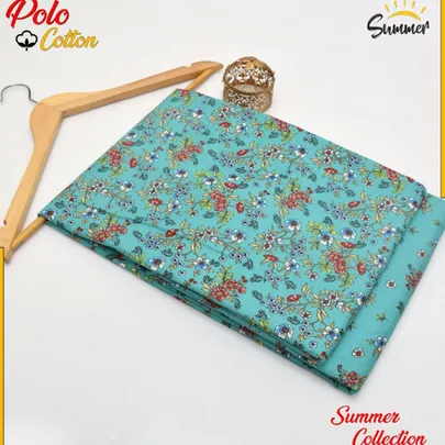 Discover the refreshing beauty of summer with this lovely aqua 2-piece floral digital print set from Polo Cotton's 2025 collection. Crafted in soft and breathable micro polo cotton, this ensemble offers both style and comfort. The charming floral design is digitally printed for lasting color vibrancy. This convenient 2-piece set is perfect for creating delightful summer outfits, ideal for the warm weather. The fabric is neatly folded on a clean, white surface, ready to be purchased and stitched. The primary color is a beautiful and refreshing shade of teal or aqua blue, a perfect hue for the hot climate of Faisalabad. It is decorated with an intricate and delicate all-over floral pattern. The small, detailed flowers and leaves are rendered in a charming mix of colors, including soft reds, maroon, white, and various shades of green, creating a harmonious and aesthetically pleasing look. The design is dense yet not overwhelming, giving the fabric a rich, vibrant appearance. Made from the brand's signature "Polo Cotton," the material is lightweight and breathable, making it an excellent choice for crafting comfortable and fashionable shalwar kameez, kurtas, or dresses for everyday wear or casual events during the summer season. This fabric combines a timeless floral design with a modern color palette, offering both elegance and comfort.