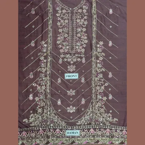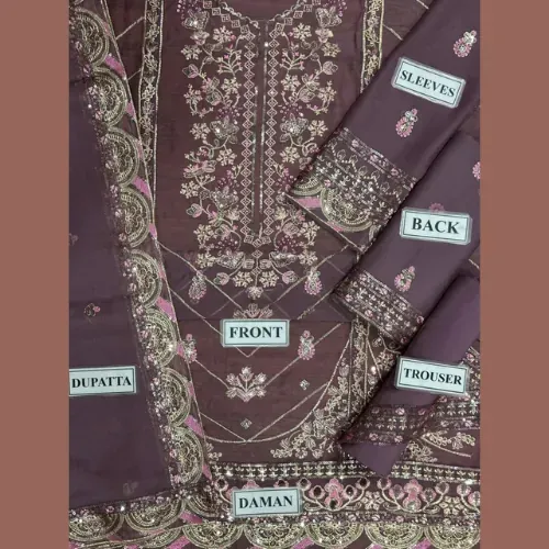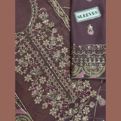 The sleeves are exquisitely designed with sequence embroidery and delicate cuff embellishments, enhancing the overall look. A plain malai trouser paired with lace creates a subtle balance, while the ready-to-wear chiffon embroidered dupatta completes the ensemble with refined charm. This unstitched suit is ideal for weddings, festive occasions, and formal gatherings, offering versatile styling with luxurious appeal.