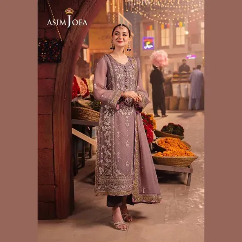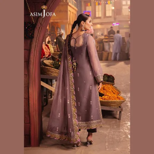 The ASIM JOFA chiffon embroidered sequence luxury 3-piece dress is a perfect blend of timeless elegance and intricate craftsmanship. The chiffon front is beautifully adorned with sequence embroidery, further elevated with a finely detailed spangle embroidered neckline. The embroidered daman for both front and back adds a touch of sophistication, while the chiffon embroidered back ensures a graceful finish.