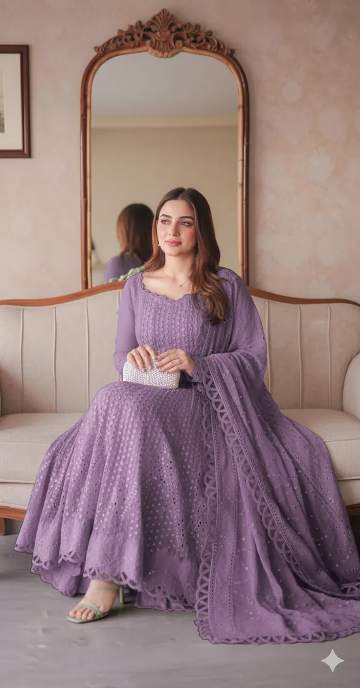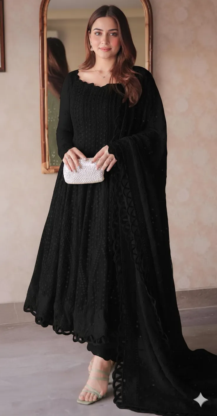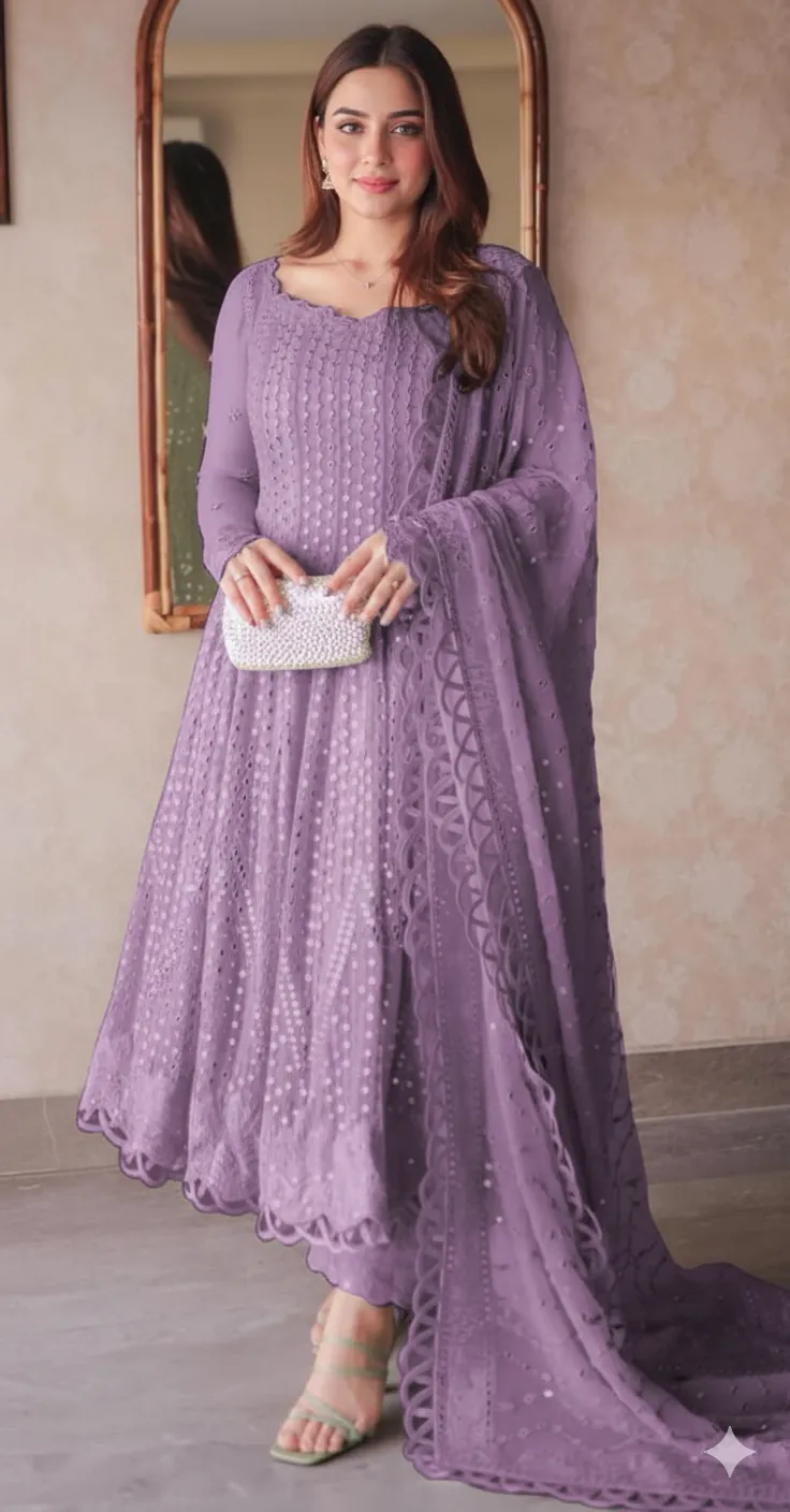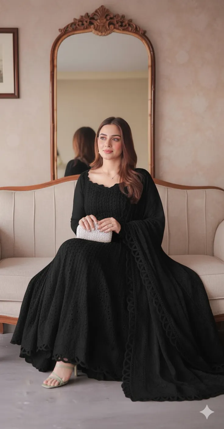 The highly demanded ASIM JOFA Unstitched Replica is AGAIN AVAILABLE ON DEMAND. This breathtaking formal ensemble is a 3-piece suit designed in a maxi/frock style, featuring intensive 9MM Sequence Work throughout.