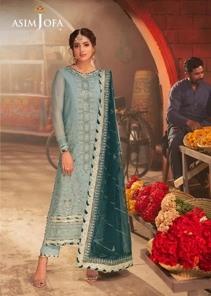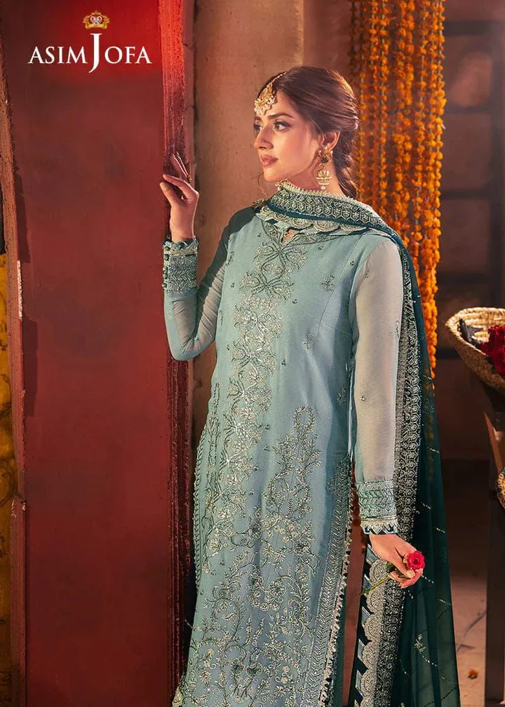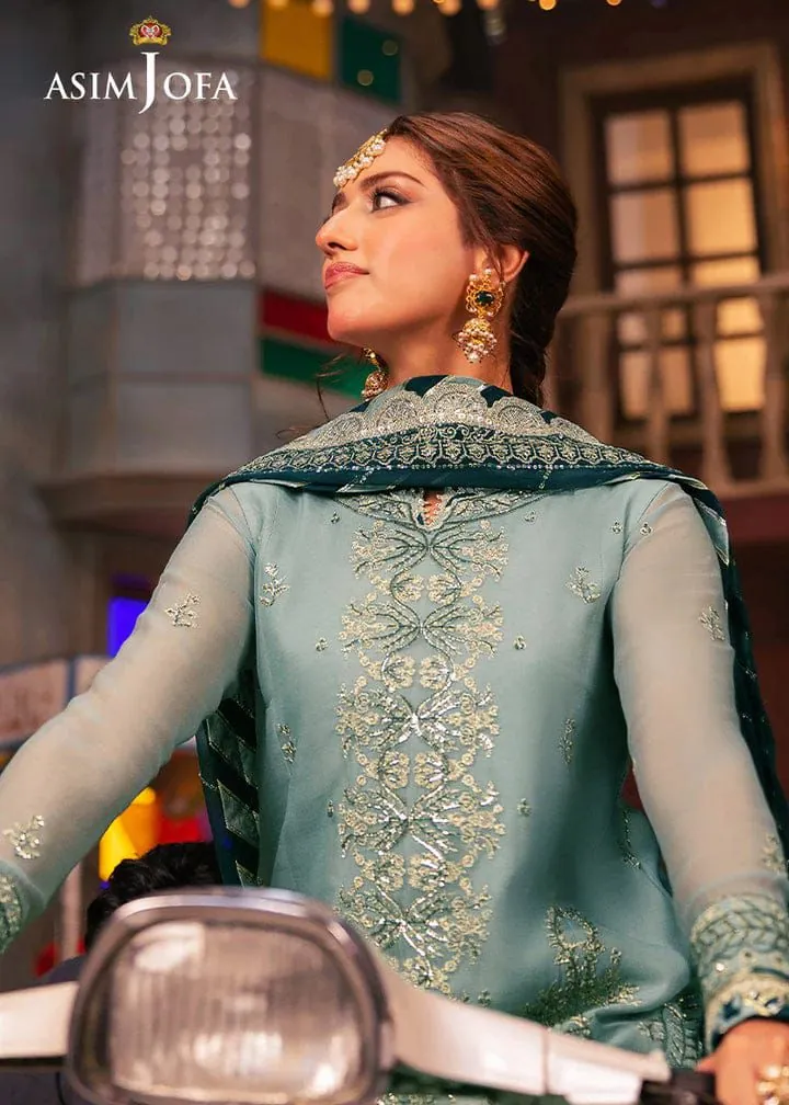 Introducing a high-quality Unstitched Replica of a luxurious ASIM JOFA Chiffon design, perfect for formal events, weddings, or festive occasions. This popular 3-piece suit is crafted from premium, flowing Chiffon fabric. The entire ensemble is adorned with intricate Sequence work (embroidery) on the shirt and dupatta, giving it a rich, heavy look and sparkle. The set includes:
