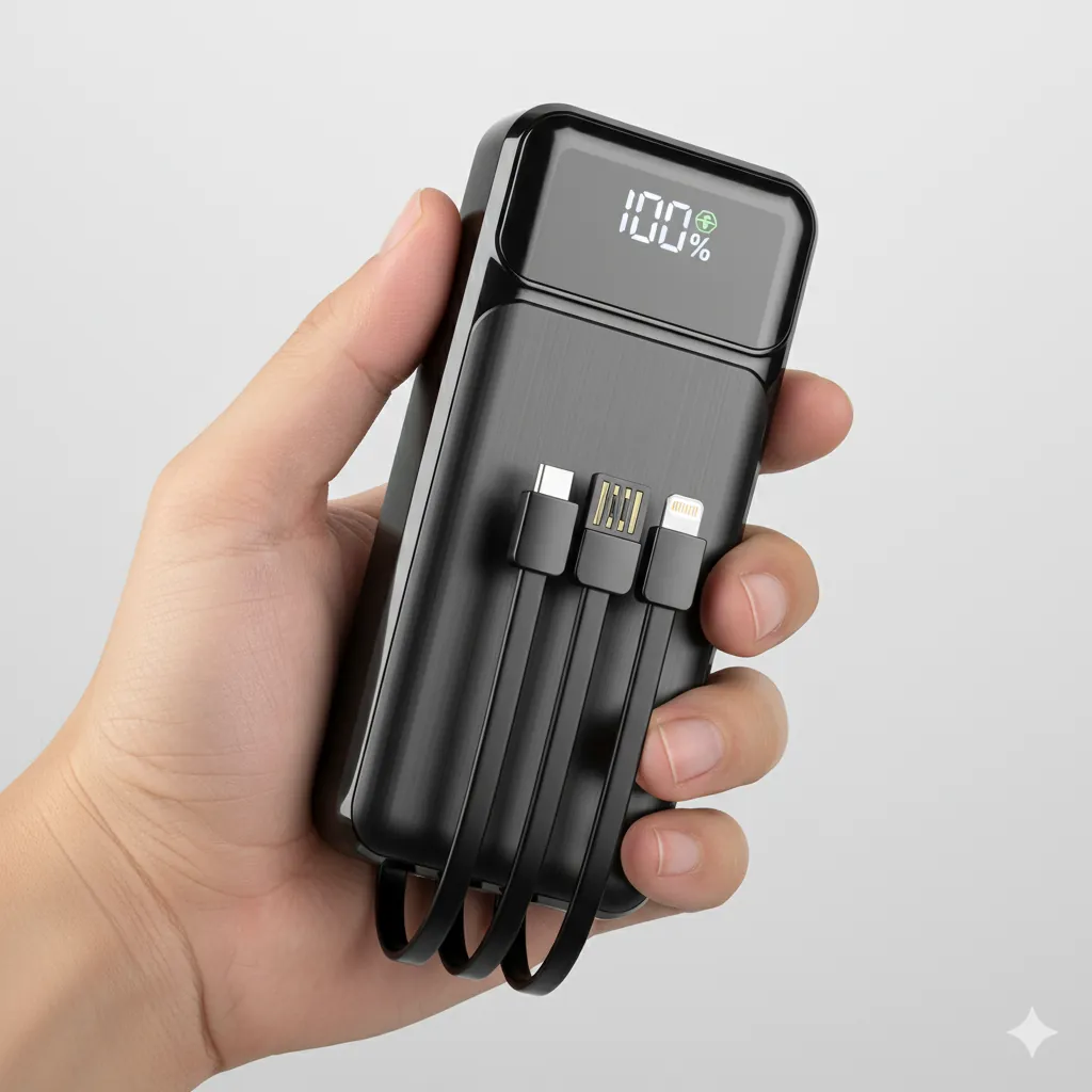 With its massive 20000mAh battery, you can charge multiple devices multiple times without worrying about running out of power. The built-in charging cables eliminate the need to carry extra cords — making it perfect for travel, work, and daily use.