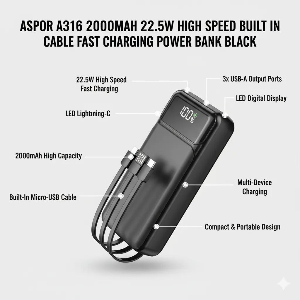 Stay fully charged wherever you go with the Aspor A316 20000mAh Power Bank.